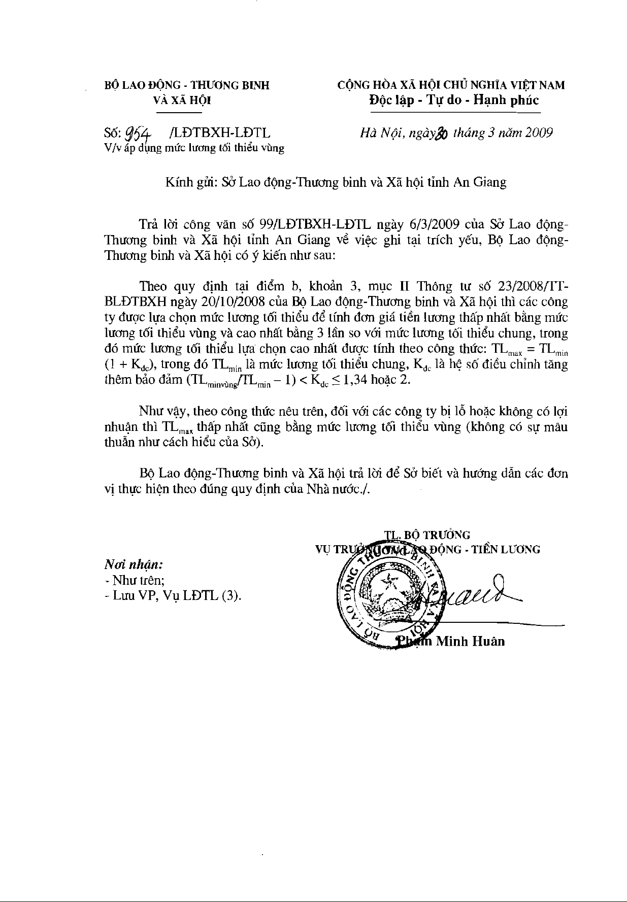 Công văn 954/LĐTBXH-LĐTL của Bộ Lao động, Thương binh và Xã hội áp dụng mức lương tối thiểu vùng