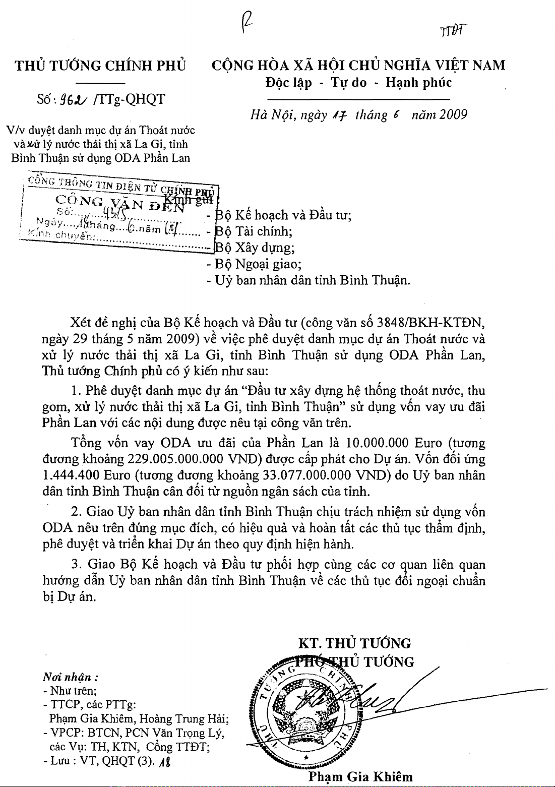 Công văn 962/TTg-QHQT của Thủ tướng Chính phủ về việc phê duyệt danh mục dự án Thoát nước và xử lý nước thải thị xã La Gi, tỉnh Bình Thuận sử dụng ODA Phần Lan