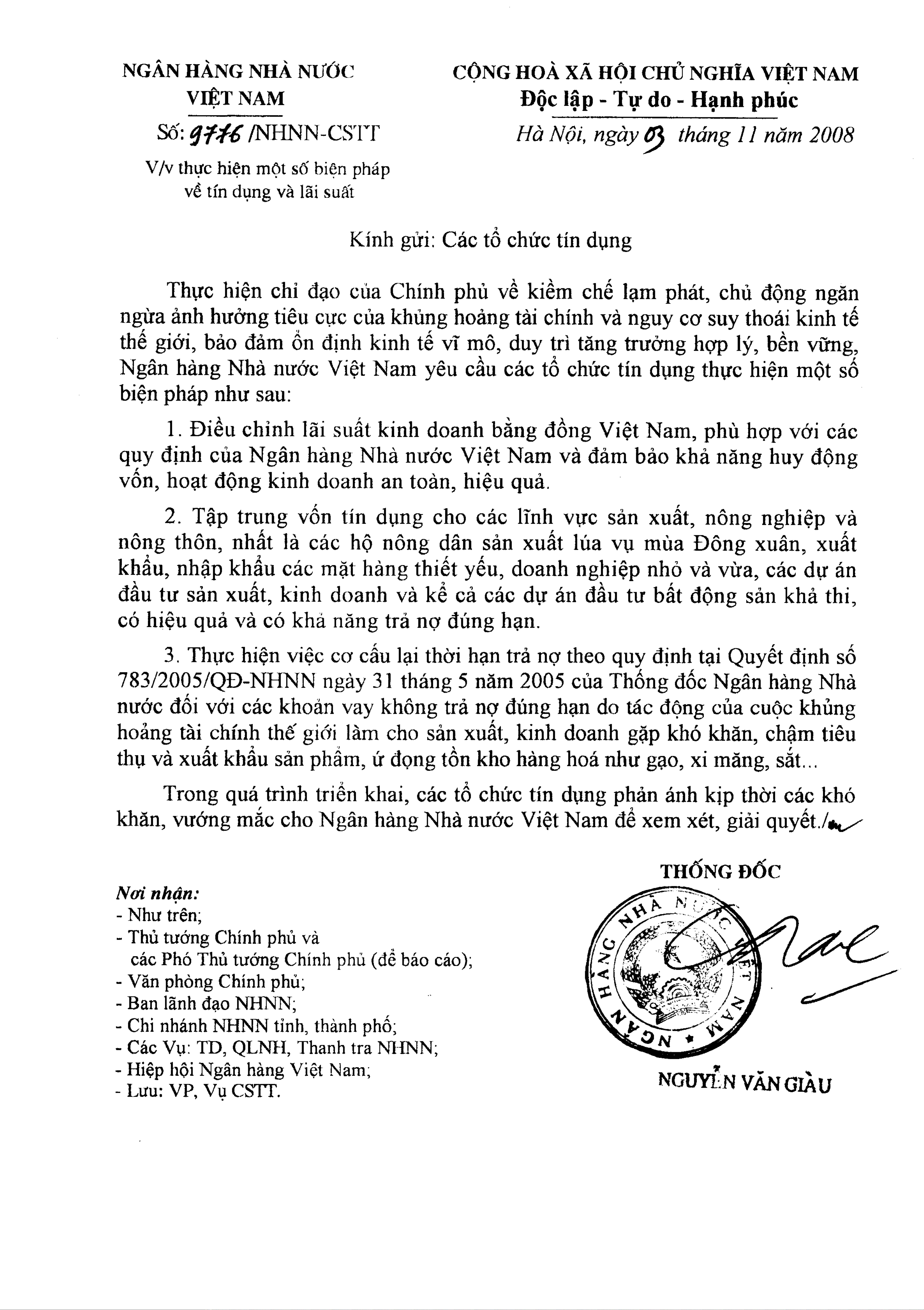 Công văn 9776/NHNN-CSTT của Ngân hàng Nhà nước về việc thực hiện một số biện pháp về tín dụng và lãi suất