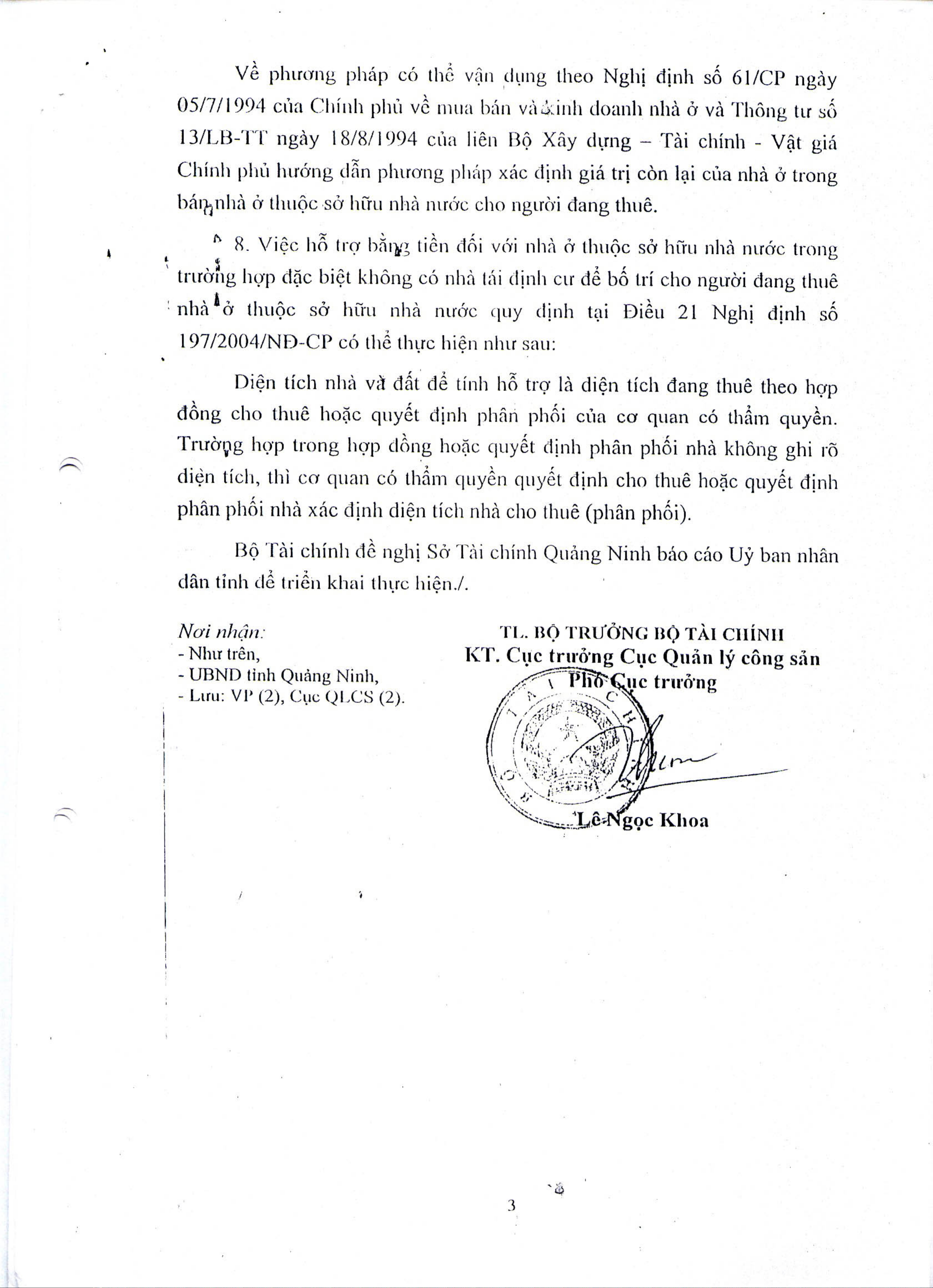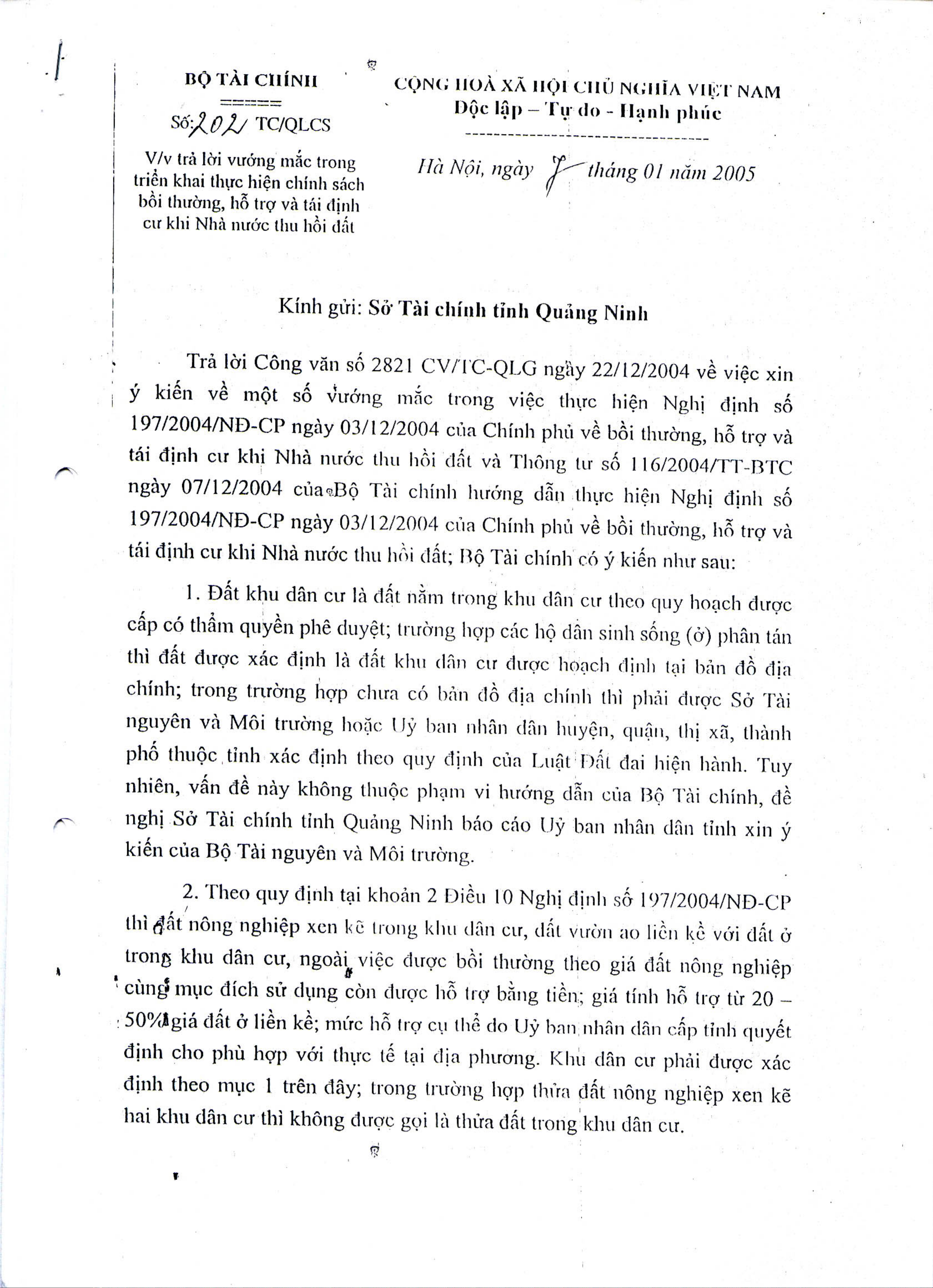 Công văn 202/TC/QLCS của Bộ Tài chính về việc trả lời vướng mắc trong triển khai thực hiện chính sách bồi thường,hỗ trợ và tái định cư khi Nhà nước thu hồi đất
