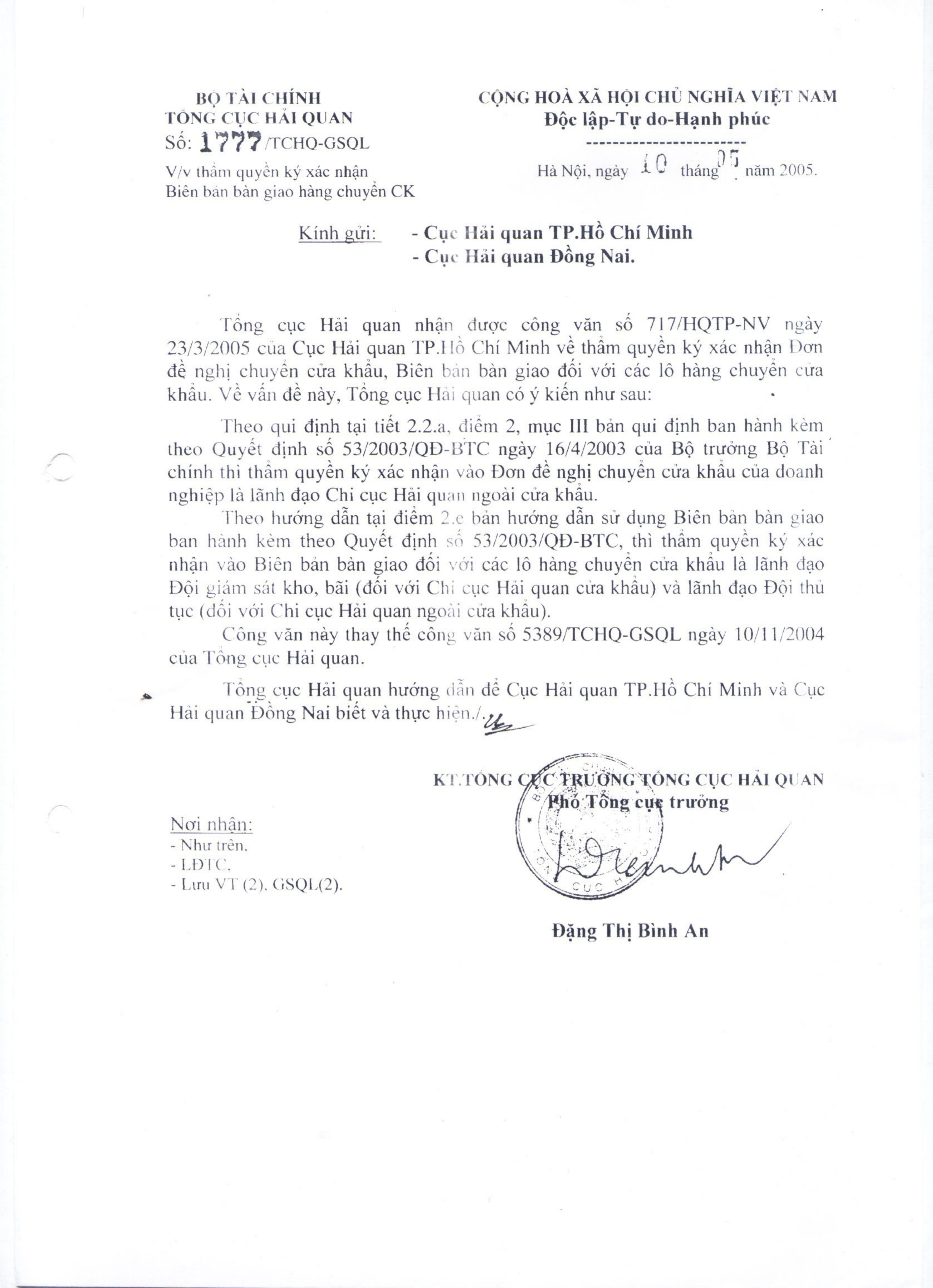 Công văn số 1777/TCHQ/GSQL của Tổng cục Hải quan về việc thẩm quyền ký xác nhận Biên bản giao hàng chuyển CK
