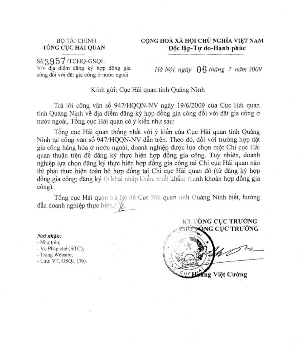 Công văn 3957/TCHQ-GSQL của Tổng cục Hải quan về việc địa điểm đăng ký hợp đồng gia công đối với đặt gia công ở nước ngoài