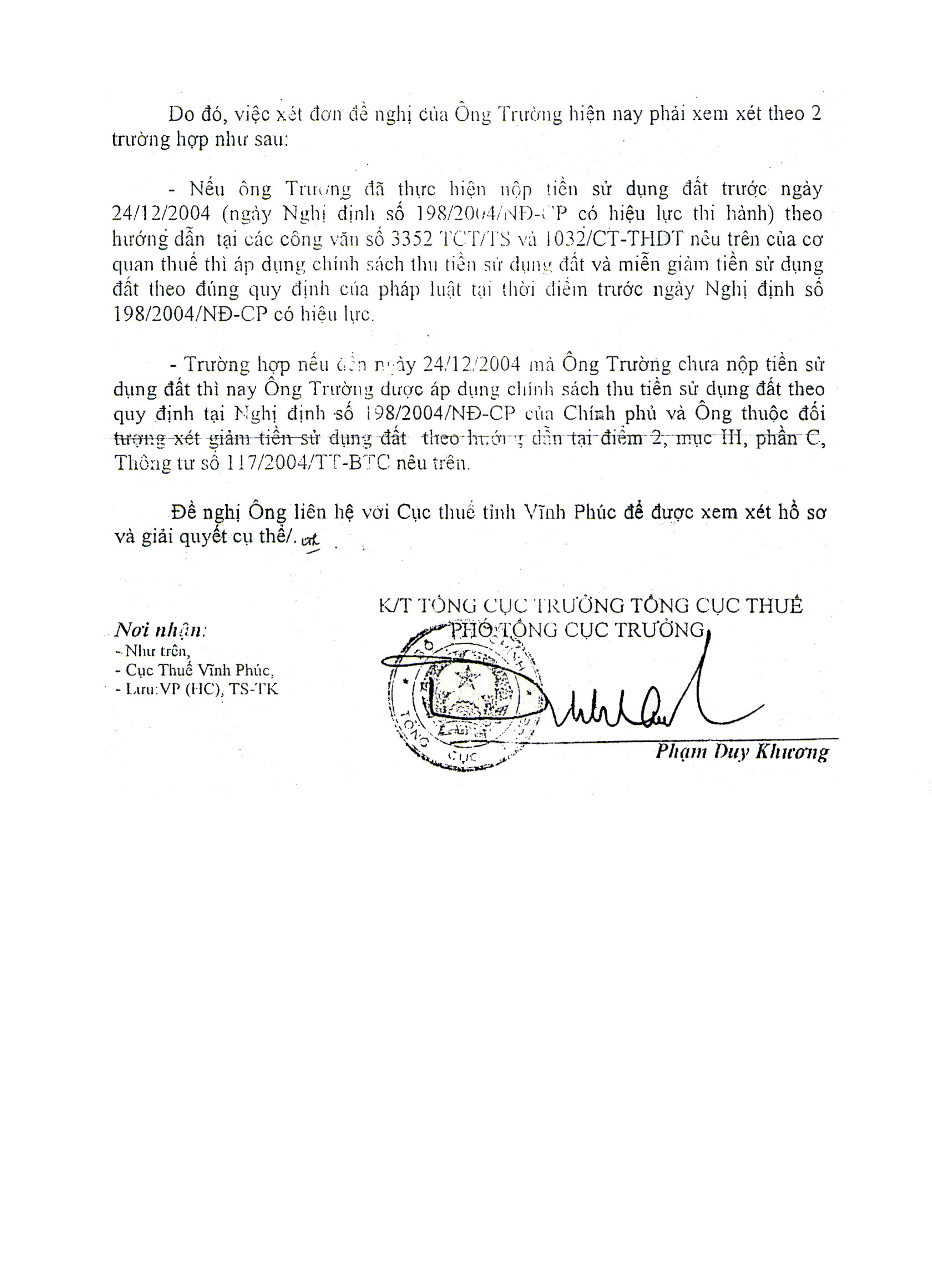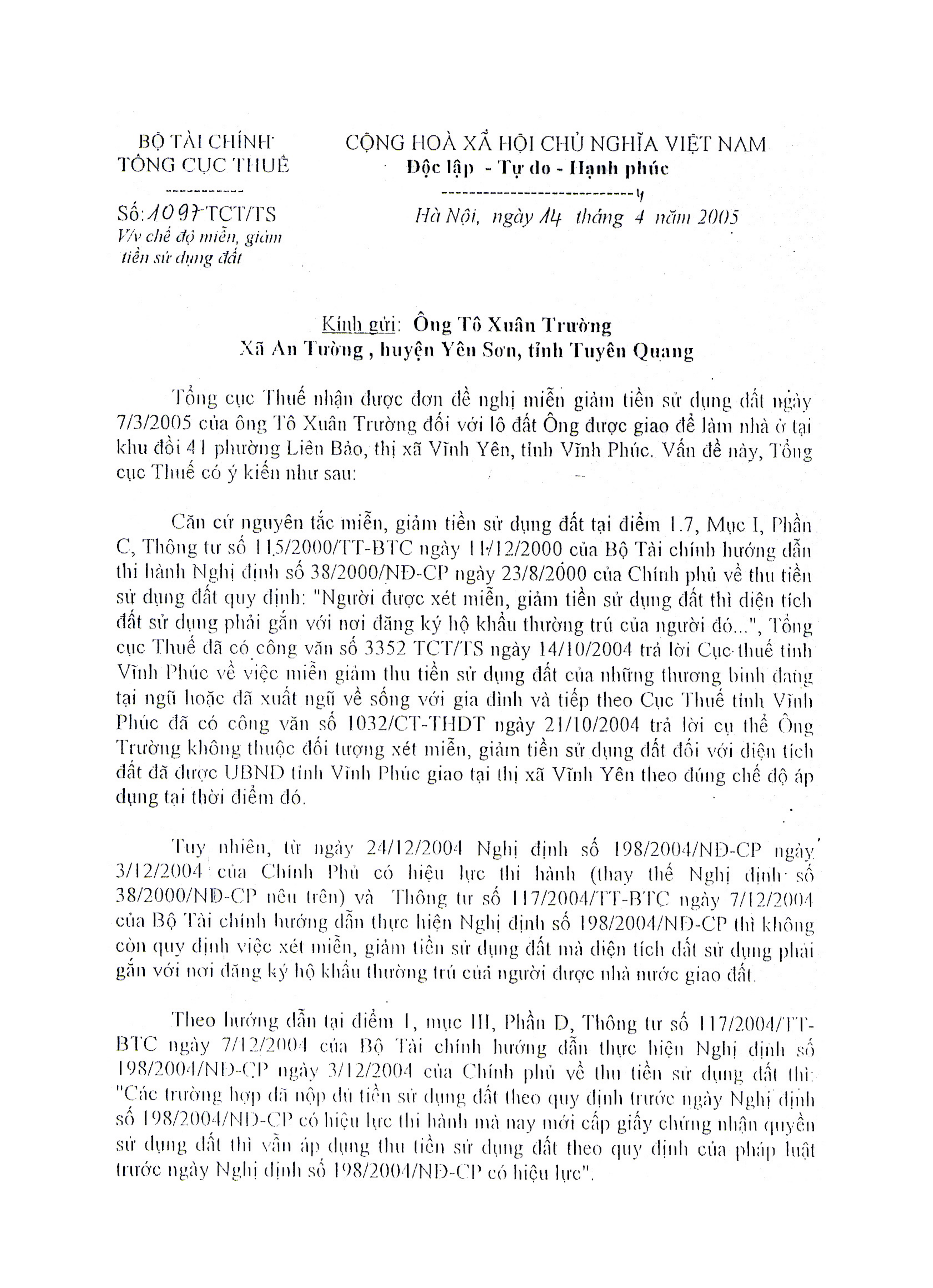 Công văn 1097/TCT/TS của Tổng cục Thuế về việc chế độ miễn, giảm tiền sử dụng đất