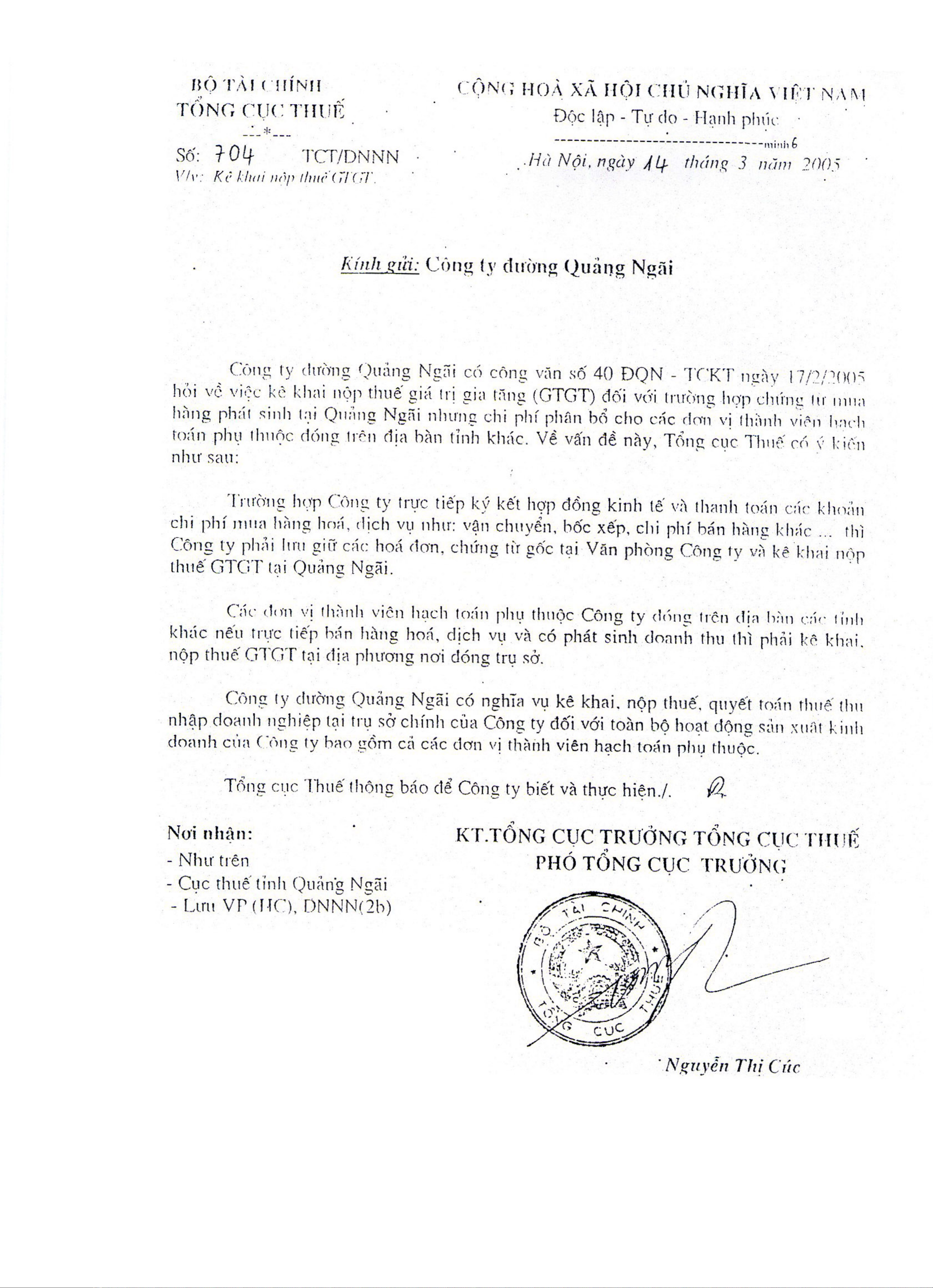 Công văn 704/TCT/DNNN của Tổng cục Thuế