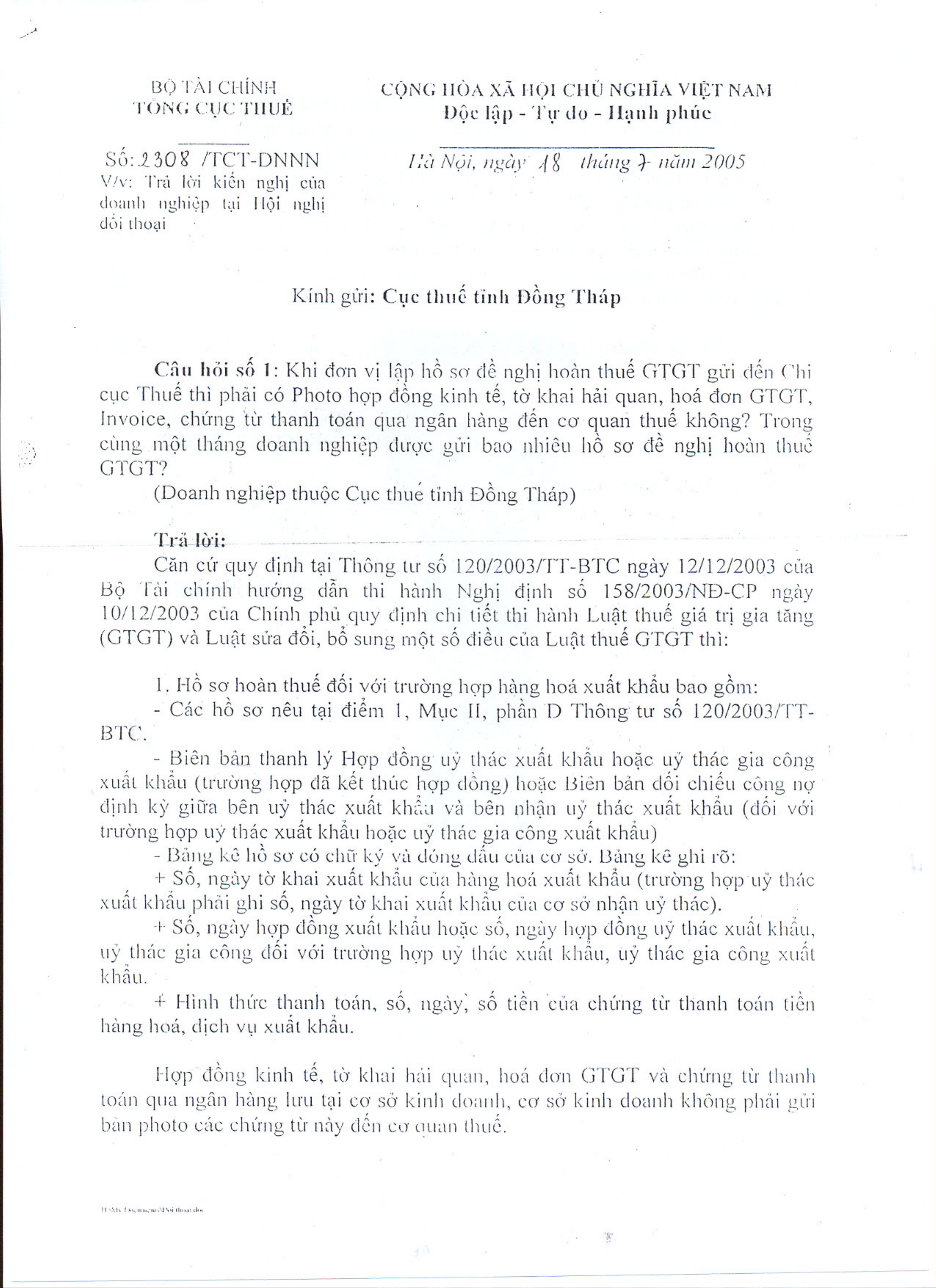 Công văn 2308/TCT/DNNN của Tổng cụcThuế về việc trả lời kiến nghị của doanh nghiệp tại hội nghị đối thoại