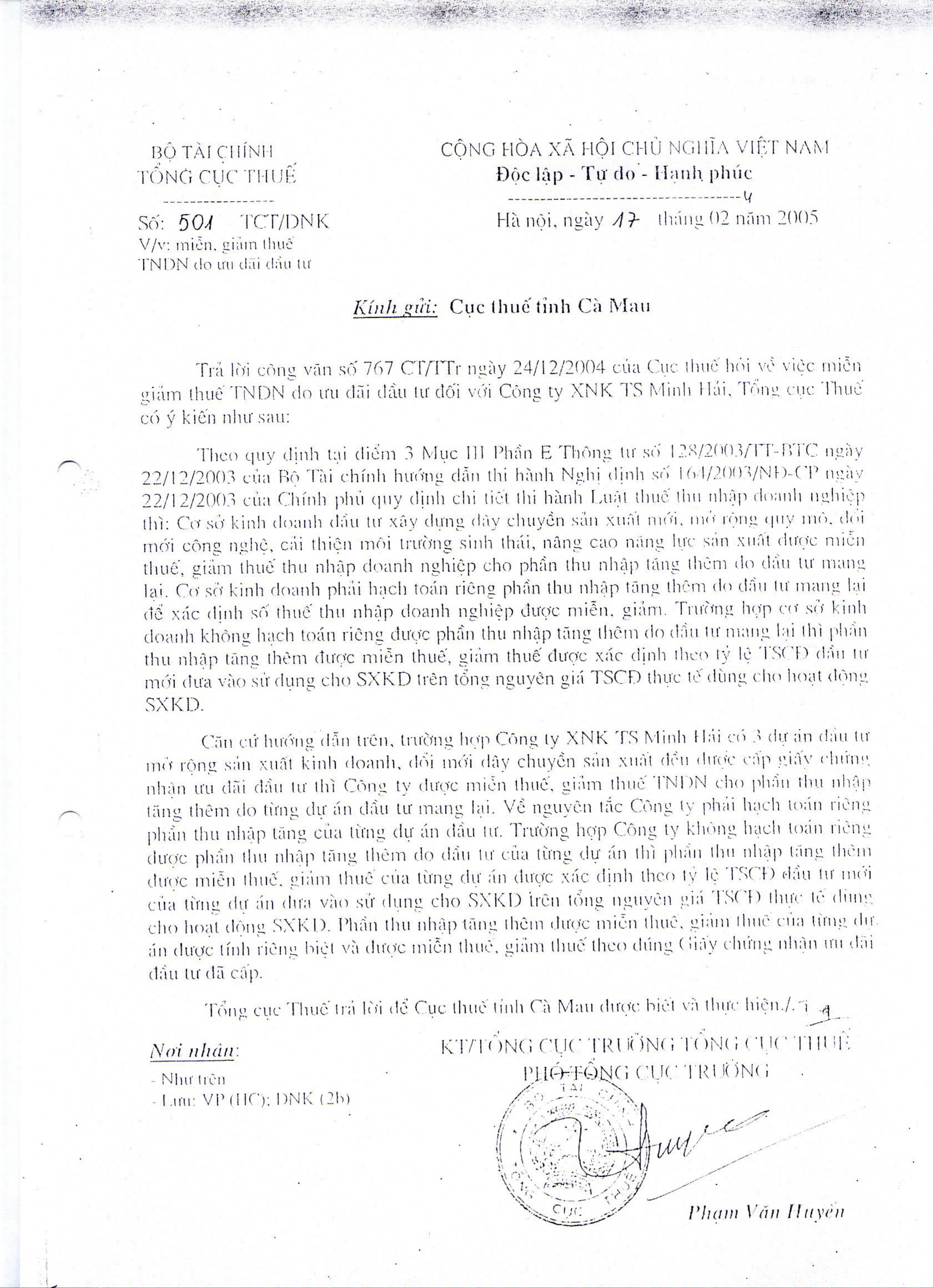 Công văn 501/TCT/DNK của Tổng cục Thuế