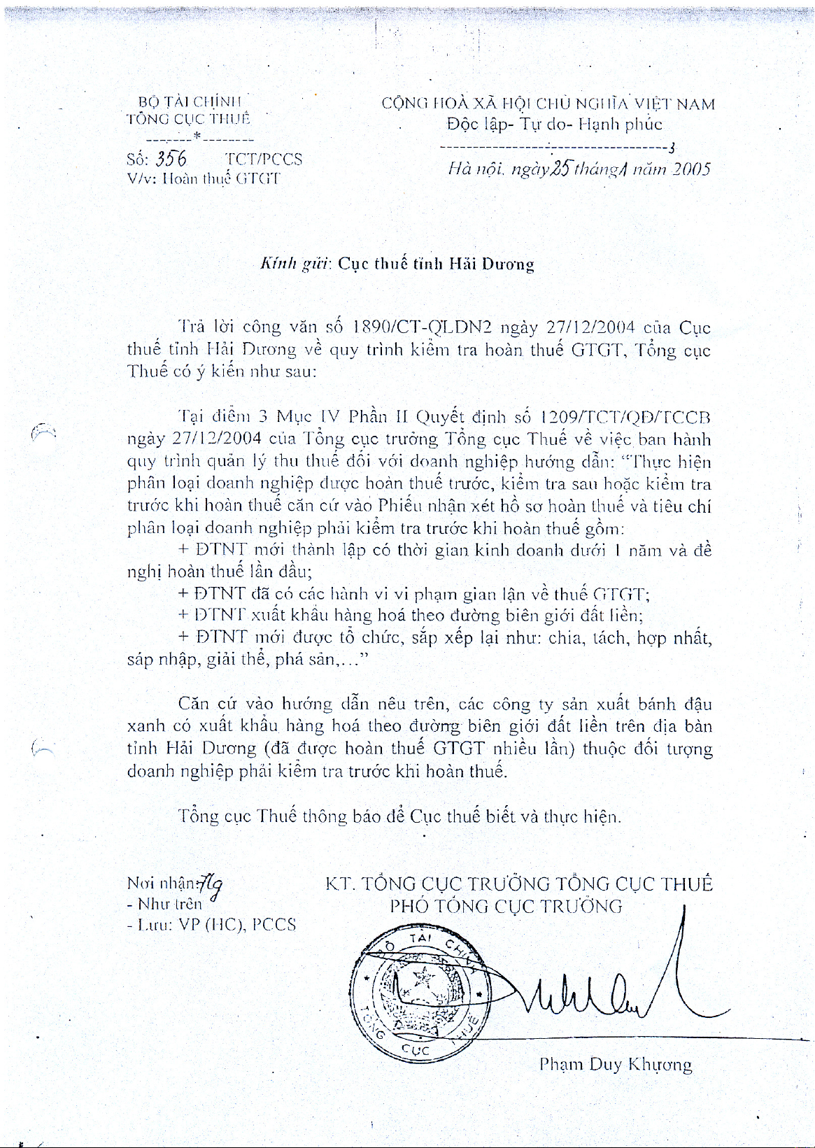 Công văn 356/TCT/PCCScủa Tổng cục Thuế