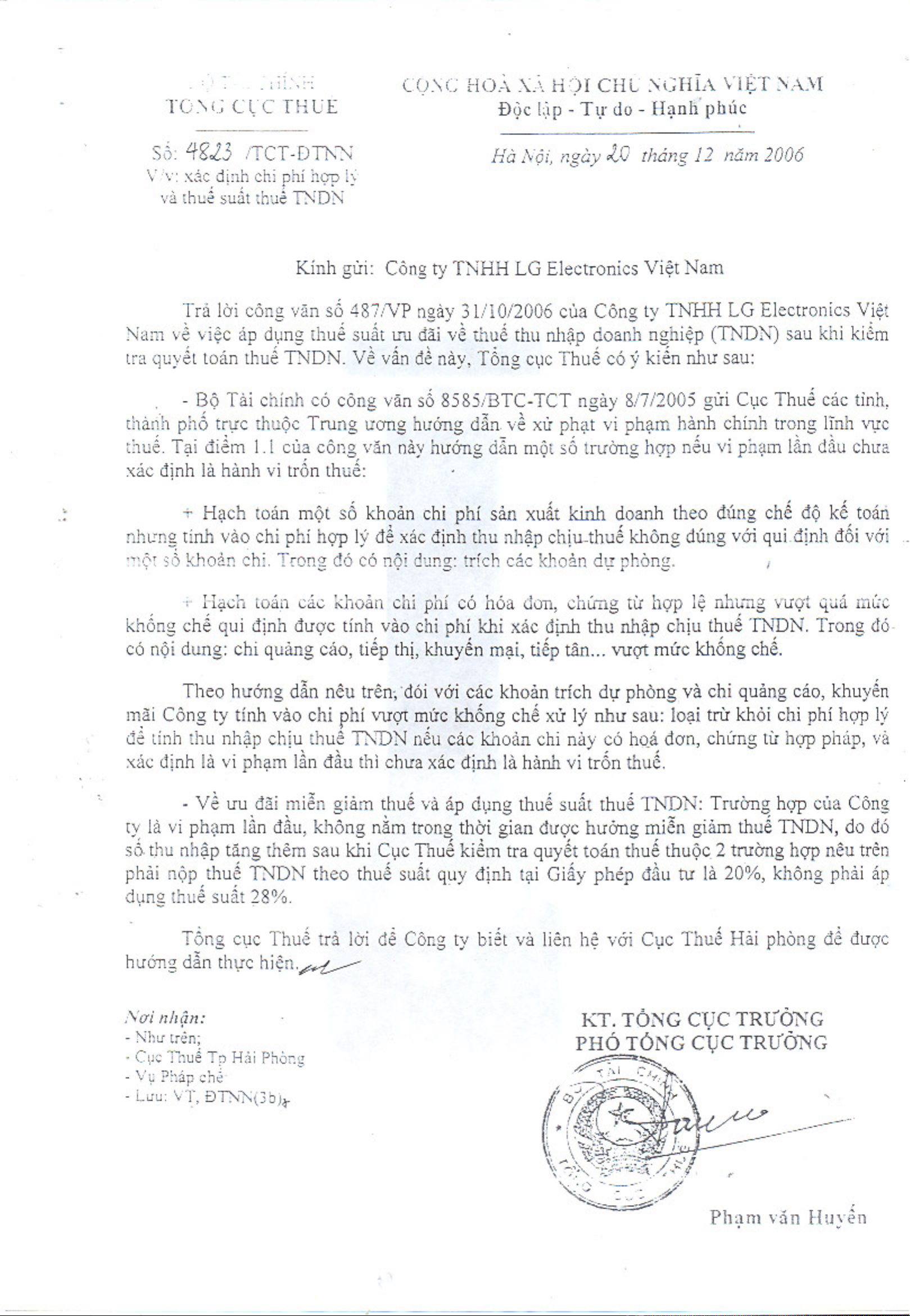 Công văn 4823/TCT-ĐTNN của Tổng cục Thuế về việc xác định chi phí hợp lý và thuế suất thuế TNDN