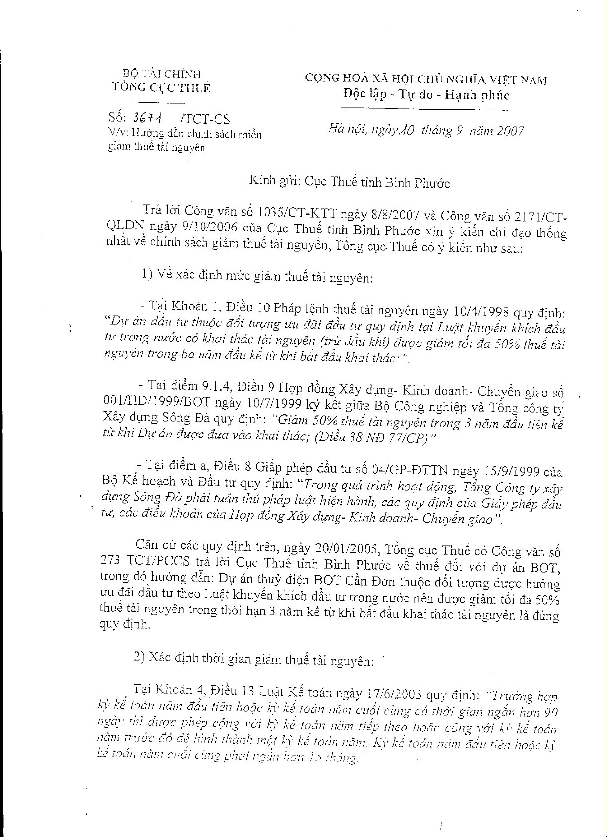 Công văn 3671/TCT-CS của Tổng cục Thuế về việc hướng dẫn chính sách miễn giảm thuế tài nguyên