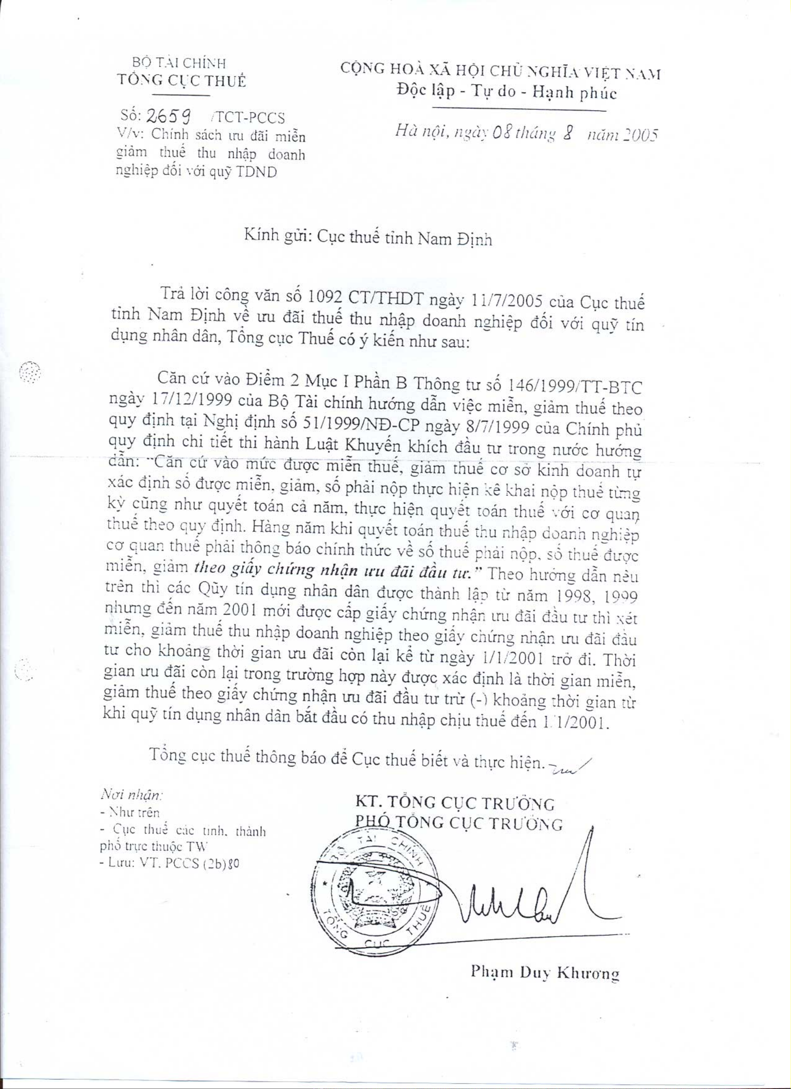 Công văn 2659/TCT-PCCS của Tổng cục Thuế về việc chính sách thuế ưu đãi miễn giảm thuế thu nhập doanh nghiệp đối với quỹ TDND