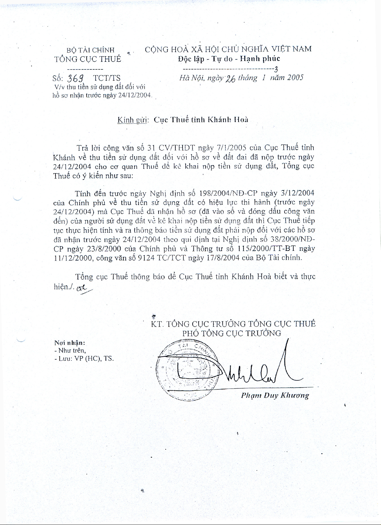 Công văn 369/TCT/TS của Tổng cục Thuế về việc thu tiền sử dụng đất đối với hồ sơ nhận trước ngày 24/12/2004