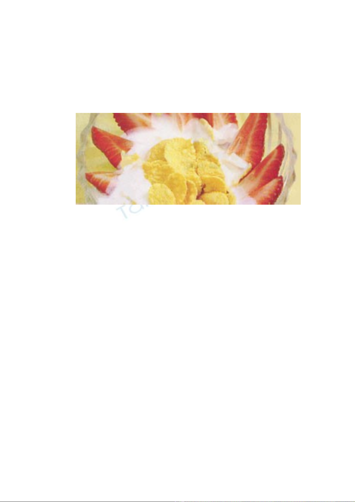 - Cho cornflake ra từng bát, thêm dâu tây, rưới sữa chua lên mặt, trộn đều trước