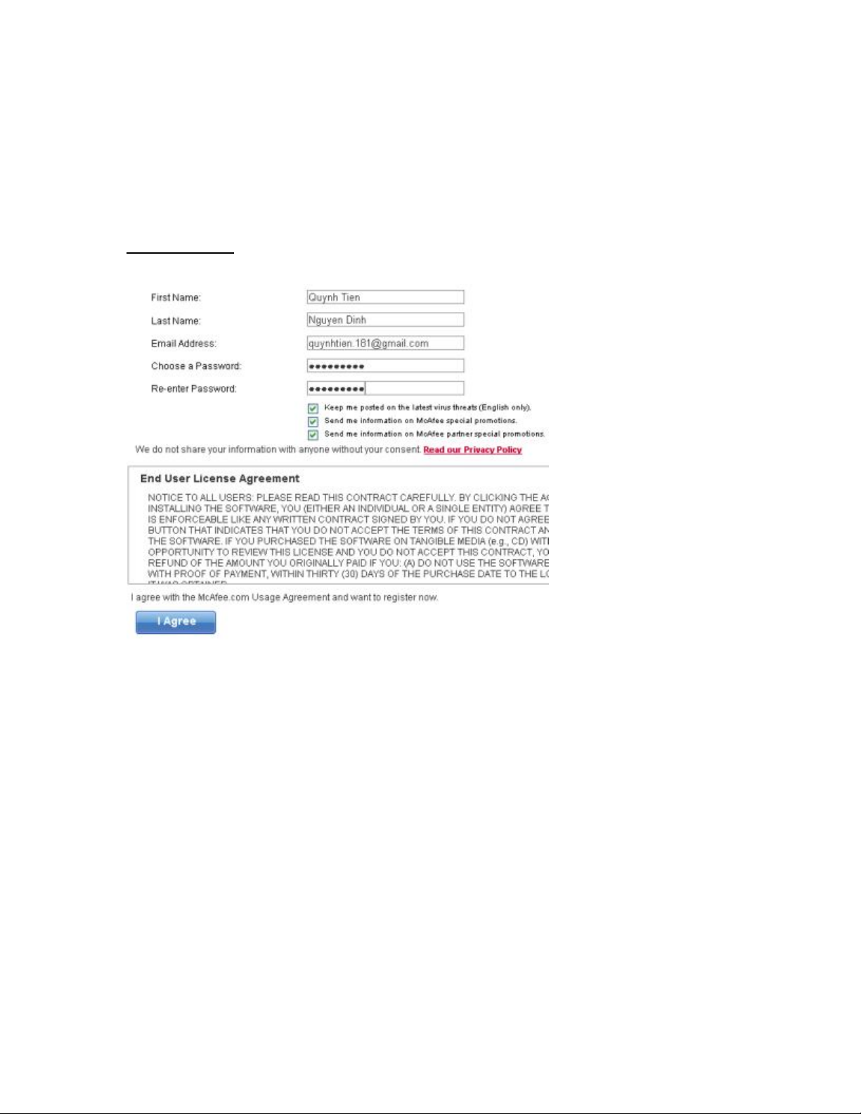 khẩu vào form trống và bấm I Agree để