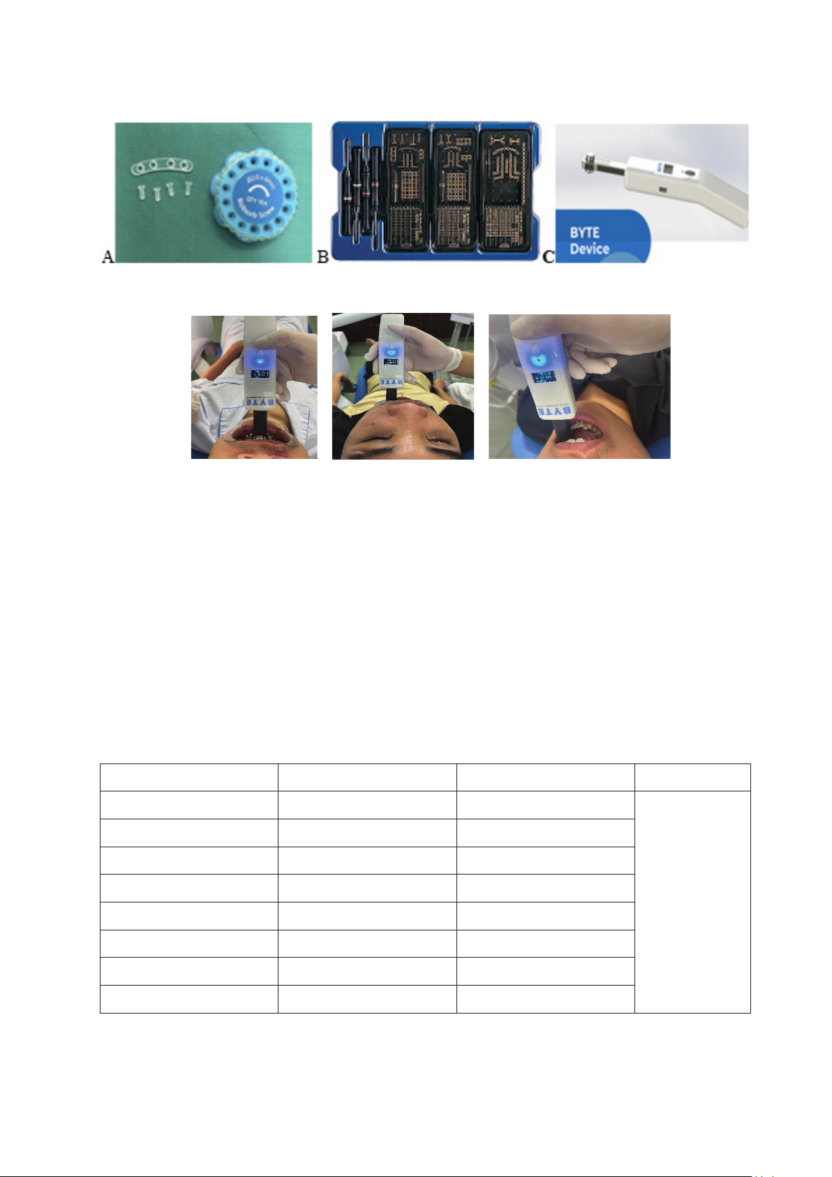 Hình 1: Phương tiện dùng trong nghiên cứu. A: Nẹp vít tự tiêu. B: Nẹp vít titanium. C: Máy đo lực cắn
