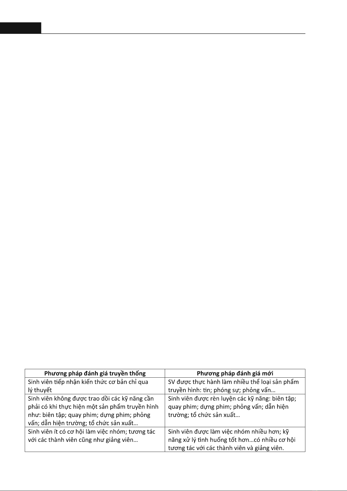 123Hong Bang Internaonal University Journal of ScienceISSN: 2615 - 9686 Tạp chí Khoa học Trường Đại học Quốc tế Hồng Bàng - Số 30 - 7/2024: 121-128riêng đối với môn “Truyền hình” có trọng số đánh giá quá trình tối đa không quá 40% tổng thành phần đánh giá, số lần đánh giá quá trình tùy vào sự tổ chức hoạt động giảng dạy của GV và có sự thống nhất giữa người dạy và người học, hình thức đánh giá có thể là: các bài tập trên lớp/về nhà; thảo luận/thuyết trình; kiểm tra viết trong thời gian ngắn tại lớp... Còn đối với đánh giá tổng kết có trọng số là 60%, hình thức đánh giá sẽ là phần thực hành các sản phẩm của cá nhân/nhóm. Nội dung để kiểm tra đánh giá được chú trọng hay chọn lọc, có thể là một chương của môn học hay nhiều hơn. Tất cả các bài kiểm tra đánh giá sẽ đưa ra các yêu cầu ở những mức độ từ việc ghi nhớ, hiểu, vận dụng, sáng tạo...đến các kỹ năng mềm như: tổ chức học tập nhóm; xử lý tình huống; giao tiếp...Sau khoảng thời gian học tập, rèn luyện, với nhiều hình thức và công cụ trong việc đánh giá kiểm tra, sẽ xác định được mức độ hoàn thành nhiệm vụ học tập của SV so với chuẩn kiến thức, kỹ năng được quy định trong chương trình đào tạo, đạt được mục tiêu đo lường, đánh giá đúng năng lực của SV. Đánh giá theo năng lực là đánh giá kiến thức, kĩ năng và thái độ của người học, đồng thời cải thiện kết quả học tập của sinh viên. Bên cạnh đó, đánh giá năng lực không hoàn toàn dựa vào chương trình đào tạo của môn học mà đó là quá trình tiếp thu, tổng hợp và ứng dụng những kiến thức, kĩ năng...từ nhiều môn học cũng như những kiến thức thực tế mà người học tích luỹ được trong quá trình học tập.1.2. Quá trình áp dụng phương pháp đánh giá môn học “Truyền hình” tại Khoa Khoa học Xã hộiMôn “Truyền hình” hiện là loại học phần cơ sở ngành bắt buộc nằm trong chương trình đào tạo ngành Truyền thông đa phương tiện (TTĐPT) dành cho sinh viên (SV) năm thứ 3. Đây là môn học cung cấp những kiến thức chung về truyền hình, như: Các khái niệm và thuật ngữ; Đặc trưng loại hình; Lịch sử truyền hình Thế giới và Việt Nam; Hệ thống đài truyền hình quốc gia và địa phương; Cơ cấu tổ chức và họat động của một đài truyền hình…Bên cạnh đó, môn học tập trung vào các nội dung như: Chương trình truyền hình và các thể loại truyền hình, qua đó giúp cho SV nắm vững được những kỹ năng cơ bản khi thực hiện một sản phẩm truyền hình như: Tin; Phỏng vấn; Phóng sự…Với 3 tín chỉ, SV sẽ có 45 giờ để tiếp cận môn học này, trong đó số giờ học lý thuyết vẫn còn chiếm đa số, phần thực hành vẫn chưa đáp ứng đủ thời gian để SV có thể hiểu sâu về từng thể loại truyền hình…Để đảm bảo được mục tiêu của môn học, từ học kì 2 của năm học 2022 – 2023 đến nay Khoa KHXH đã có một số những điều chỉnh trong phương pháp kiểm tra đánh giá môn học.Qua tìm hiểu nghiên cứu các hình thức và phương pháp kiểm tra đánh giá, Khoa KHXH đã lựa chọn các phương pháp giảng dạy phù hợp với đặc thù của môn học. Từ khoá đào tạo năm 2020 (học kỳ 2 – năm học 2022 – 2023), Khoa tiến hành thực hiện việc đánh giá năng lực người học bằng 2 phương pháp: phát huy cá nhân hóa người học và kết hợp đa dạng hoá kiểm tra đánh giá theo sản phẩm.Phương pháp phát huy cá nhân hóa người học là giải pháp giảng dạy tích cực, vận dụng các phương pháp tổ chức và đổi mới các hoạt động học tập cho SV (bắt đầu một bài học mới bằng 1 trò chơi khởi động; Dùng các sản phẩm media để làm ví dụ và đưa ra yêu cầu bài tập tại lớp; thay vì các giờ học lý thuyết khô cứng giới hạn trong không gian hẹp, GV sẽ đưa đề tài để SV thực hiện nhanh các sản phẩm ở ngoài lớp học…tổ chức lớp học thành nhiều nhóm nhỏ; thay đổi không gian thực hành ở ngoài trường…); rèn luyện tính tự học (yêu cầu SV làm bài tập về nhà; nghiên cứu; tìm tài liệu tham khảo các nội dung trước khi vào bài học mới…); tăng cường học tập cá nhân, phối hợp với học tập nhóm (GV đưa ra nhiều dạng bài tập cá nhân/nhóm, yêu cầu mỗi SV phải tự chủ động, phát huy tính tự lập, thể hiện đầy đủ vai trò/nhiệm vụ của SV trong quá trình làm việc nhóm…). Để thực hiện có hiệu quả việc tổ chức học tập cho SV theo hướng phát huy cá nhân hóa người học, GV sẽ là người định hướng, đưa ra những ví dụ/đề tài mang tính thực tế, để SV có điều kiện quan sát trực tiếp, cùng thảo luận, làm bài thực hành...Từ đó, giúp cho SV tiếp thu dễ dàng những kiến thức cơ bản, những kỹ năng cần có của môn học và phát huy tư duy sáng tạo. Phương pháp này đòi hỏi GV không chỉ đơn giản là truyền đạt kiến thức mà còn hướng dẫn SV thực hiện các loại sản phẩm truyền hình. Việc thiết kế, thay đổi chư