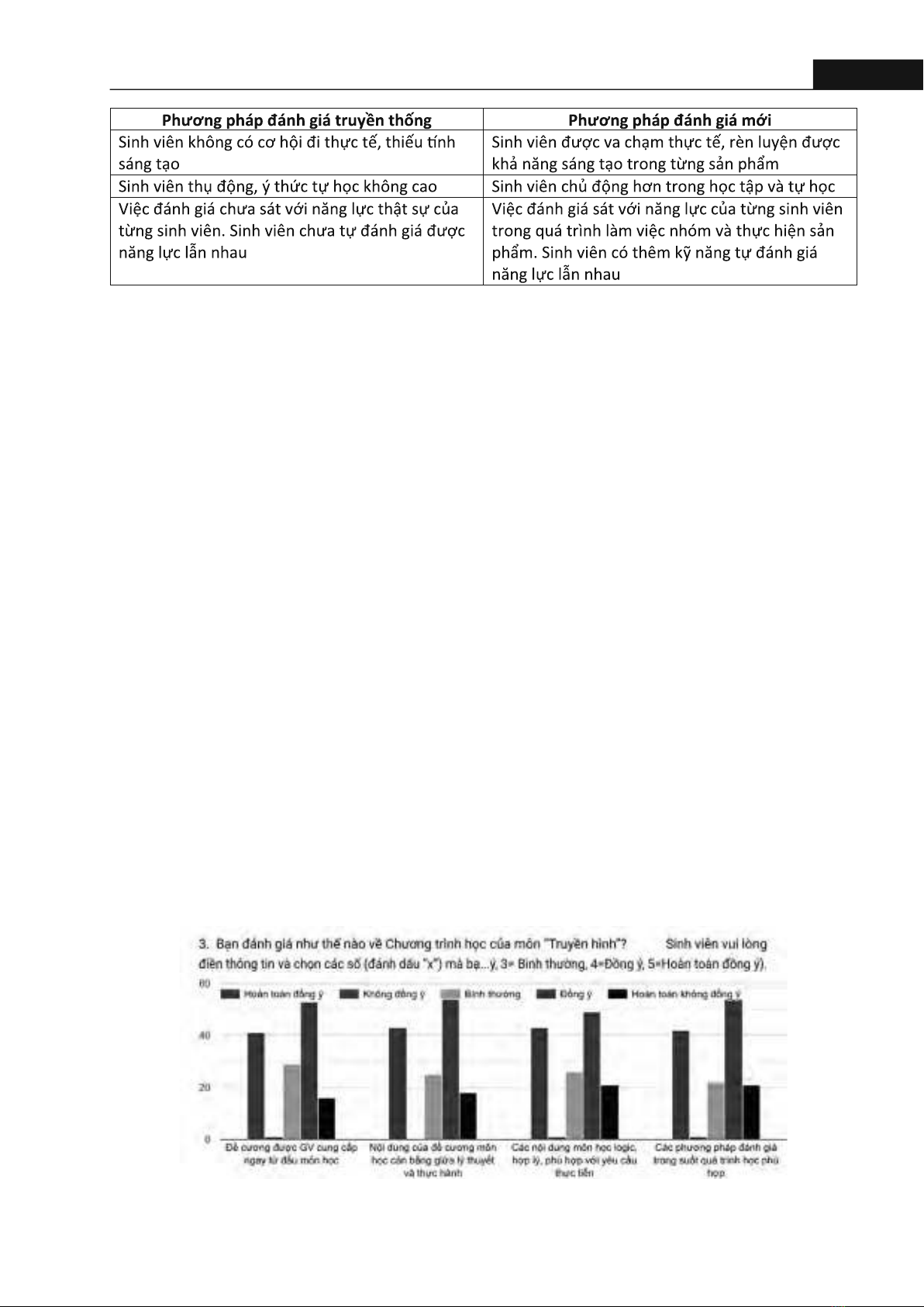 125Hong Bang Internaonal University Journal of ScienceISSN: 2615 - 9686 Tạp chí Khoa học Trường Đại học Quốc tế Hồng Bàng - Số 30 - 7/2024: 121-128Với việc so sánh hiệu quả các phương pháp kiểm tra đánh giá ở Bảng 2, có thể thấy như trước đây là theo hướng tiếp cận nội dung, chỉ dựa trên việc tổ chức học tập tại lớp, GV lên lớp thuyết giảng, toàn bộ nội dung bài giảng vẫn không “thoát” được slide giáo án được trình chiếu. Trong khi đó, số SV ghi chép bài ngày càng ít, các bạn giờ đây lên lớp có thể xin slide bài giảng từ GV hay chụp ảnh bài giảng tại lớp…các giờ học đặt nặng phần lý thuyết, nội dung chỉ tập trung vào kiến thức hàn lâm, SV không có điều kiện tương tác, thảo luận…thực hành làm sản phẩm. Việc kiểm tra đánh giá kết quả học tập chủ yếu là thi viết để kiểm tra lại kiến thức lý thuyết đã học khi kết thúc môn. Việc đánh giá được thực hiện chỉ từ một phía là GV bộ môn, người học hoàn toàn không được thể hiện khả năng tự đánh giá…Điều này, làm cho SV gặp khó khăn trong việc tiếp thu bài học, lười tư duy, thụ động trong học tập…dẫn đến việc đánh giá không đúng năng lực của người học. Do đặc thù của môn “Truyền hình” – là một học phần chuyên ngành mang tính ứng dụng, đòi hỏi SV không những phải nắm vững kiến thức cơ bản mà phải thể hiện được tính chủ động, sáng tạo, rèn luyện kỹ năng trong quá trình thực hiện các thể loại sản phẩm truyền hình, nên việc điều chỉnh phương pháp tổ chức học tập cũng như phương pháp đánh giá kết quả học tập của SV đảm bảo được mục tiêu của môn học và chuẩn đầu ra là điều tất yếu.2. PHƯƠNG PHÁP NGHIÊN CỨUQuan sát quá trình học tập của SV qua thực tế giảng dạy; Tổ chức hoạt động kiểm tra đánh giá trên môn học, thu thập số liệu, thống kê và đối chiếu số liệu. Đối tượng là 140 SV của 2 khoá 20 và 21; Trên học phần chuyên ngành “Truyền hình” thuộc ngành TTĐPT: Thời gian: 2 học kỳ của 2 năm học 2022 – 2023; 2023 – 2024.K20: 56 câu trả lời chiếm 40%.K21: 84 câu trả lời chiếm 60%.Mục tiêu: Khảo sát, lấy ý kiến người học về Chương trình môn học “Truyền hình”; những thuận lợi và khó khăn của SV trong quá trình thực hiện sản phẩm…Từ đó, rút ra một số những ưu điểm/hạn chế của việc áp dụng phương pháp đánh giá môn học bằng sản phẩm, đề xuất giải pháp điều chỉnh trong kiểm tra và đánh giá môn “Truyền hình” trong thời gian tới.3. KẾT QUẢ VÀ THẢO LUẬN3.1. Kết quả khảo sát về ưu điểm của phương pháp đánh giá môn học thông qua việc thực hiện các sản phẩm Khi được hỏi về chương trình học của môn “Truyền hình”, bên cạnh việc đánh giá về đề cương, nội dung môn học, đa số SV đều đồng ý về các phương pháp đánh giá trong suốt quá trình học là phù hợp, chiếm tỷ lệ 38.5%.Hình 1. Biểu đồ khảo sát về Chương trình học môn “Truyền hình”