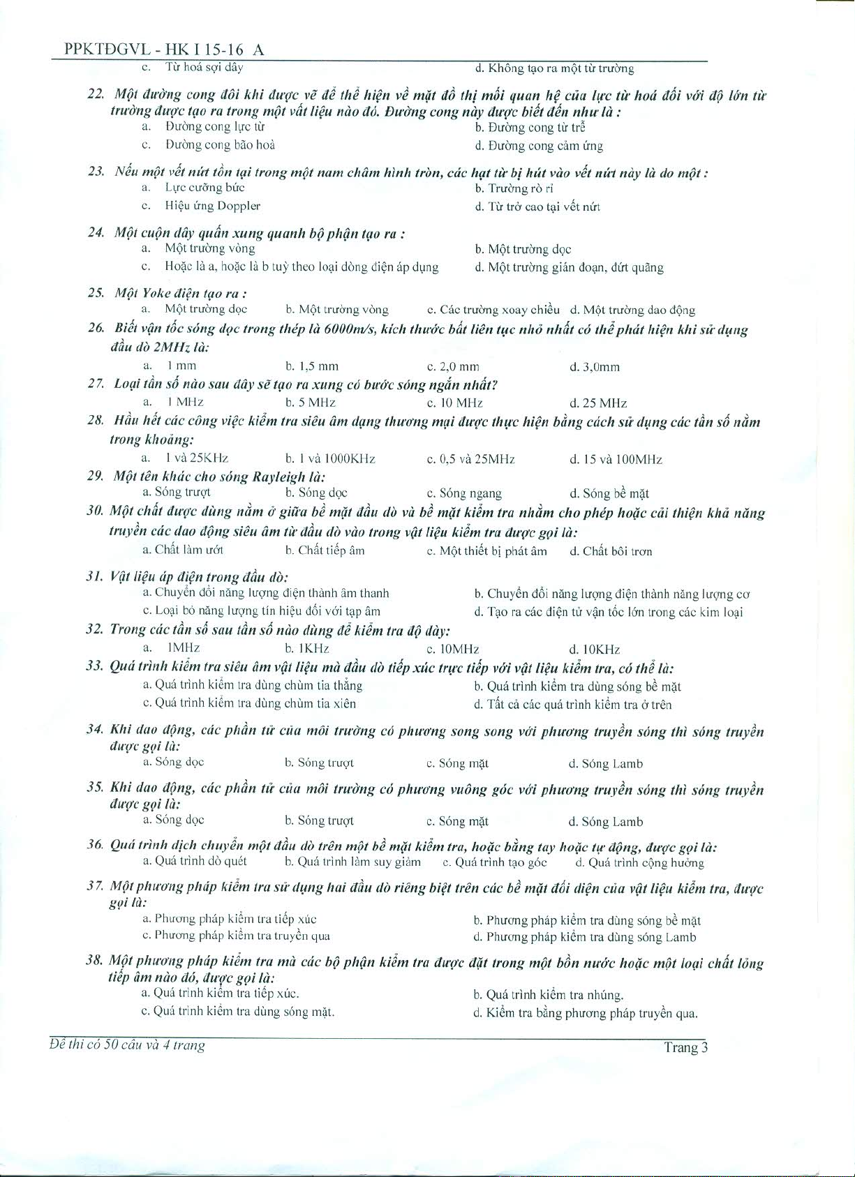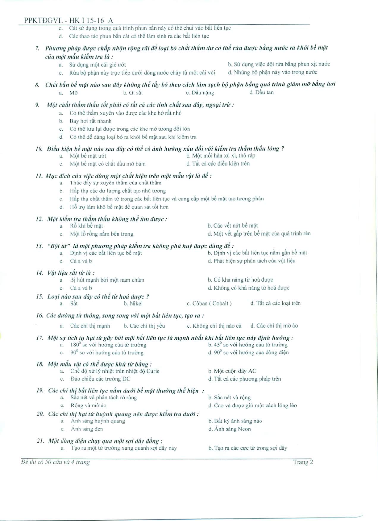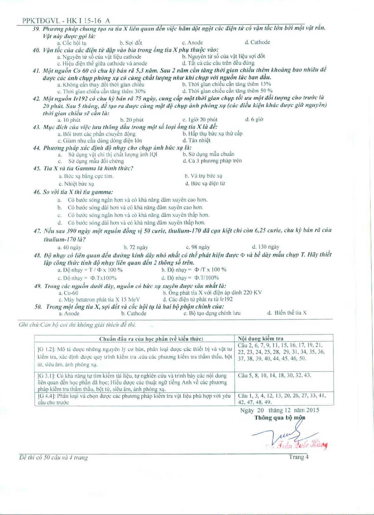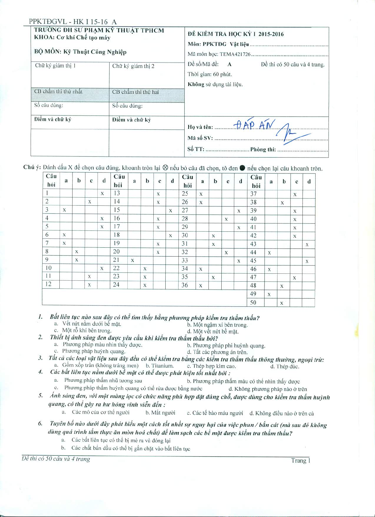 Đáp án đề kiểm tra học kỳ I năm học 2015-2016 môn Phương pháp kiểm tra đánh giá vật liệu (Mã đề A) - ĐH Sư phạm Kỹ thuật
