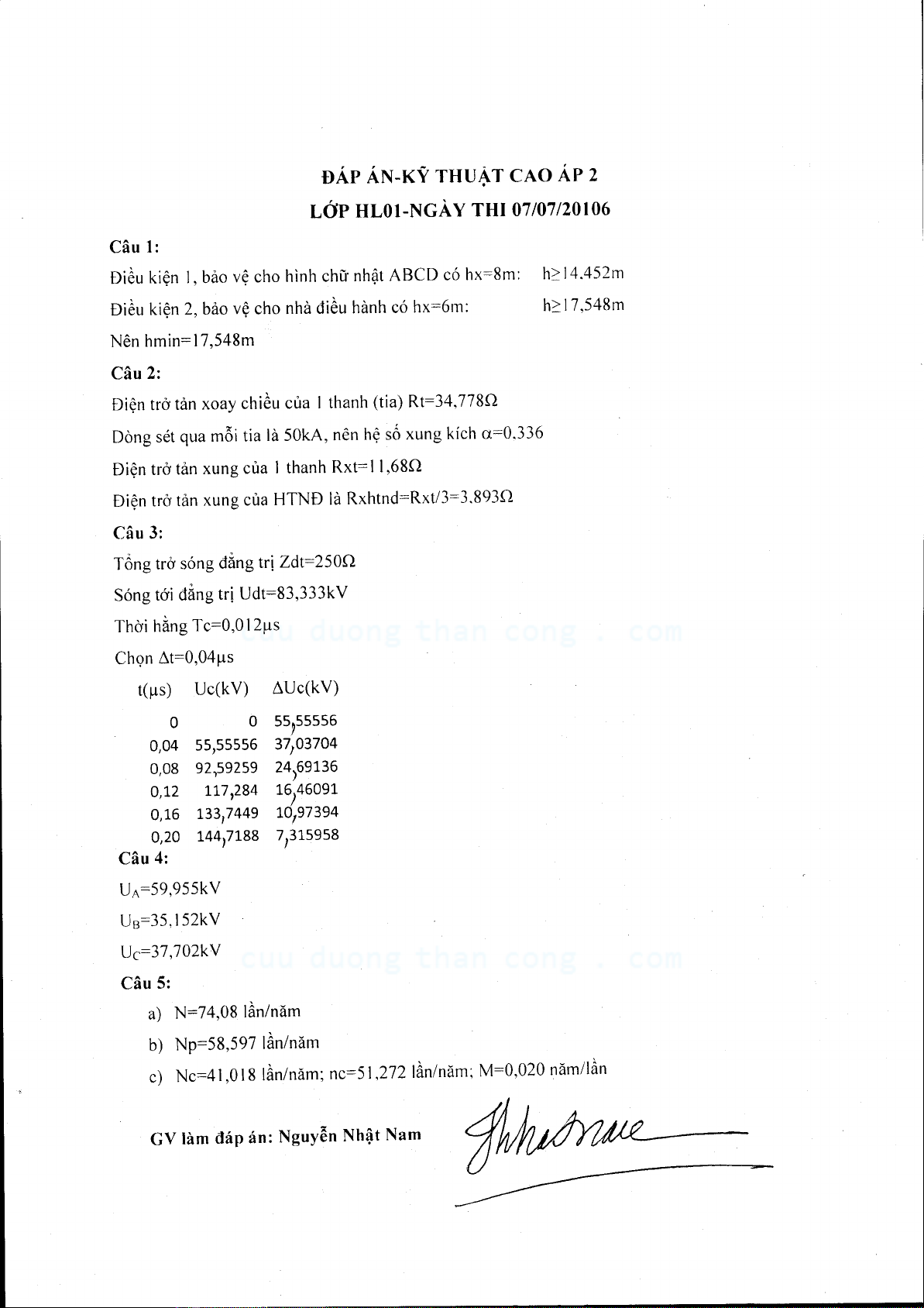 Đáp án đề thi cuối kỳ môn Kỹ thuật cao áp 2
