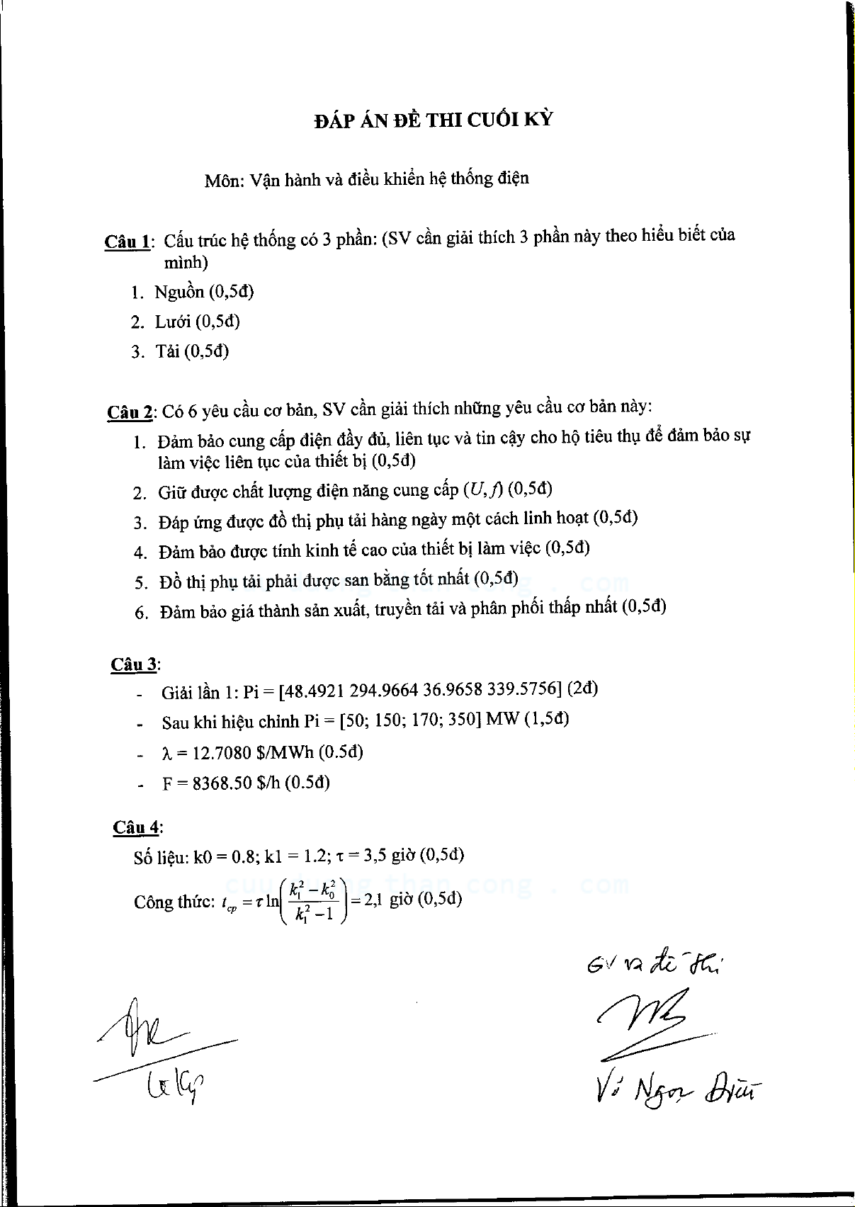 Đáp án đề thi cuối kỳ môn Vận hành và điều khiển hệ thống điện