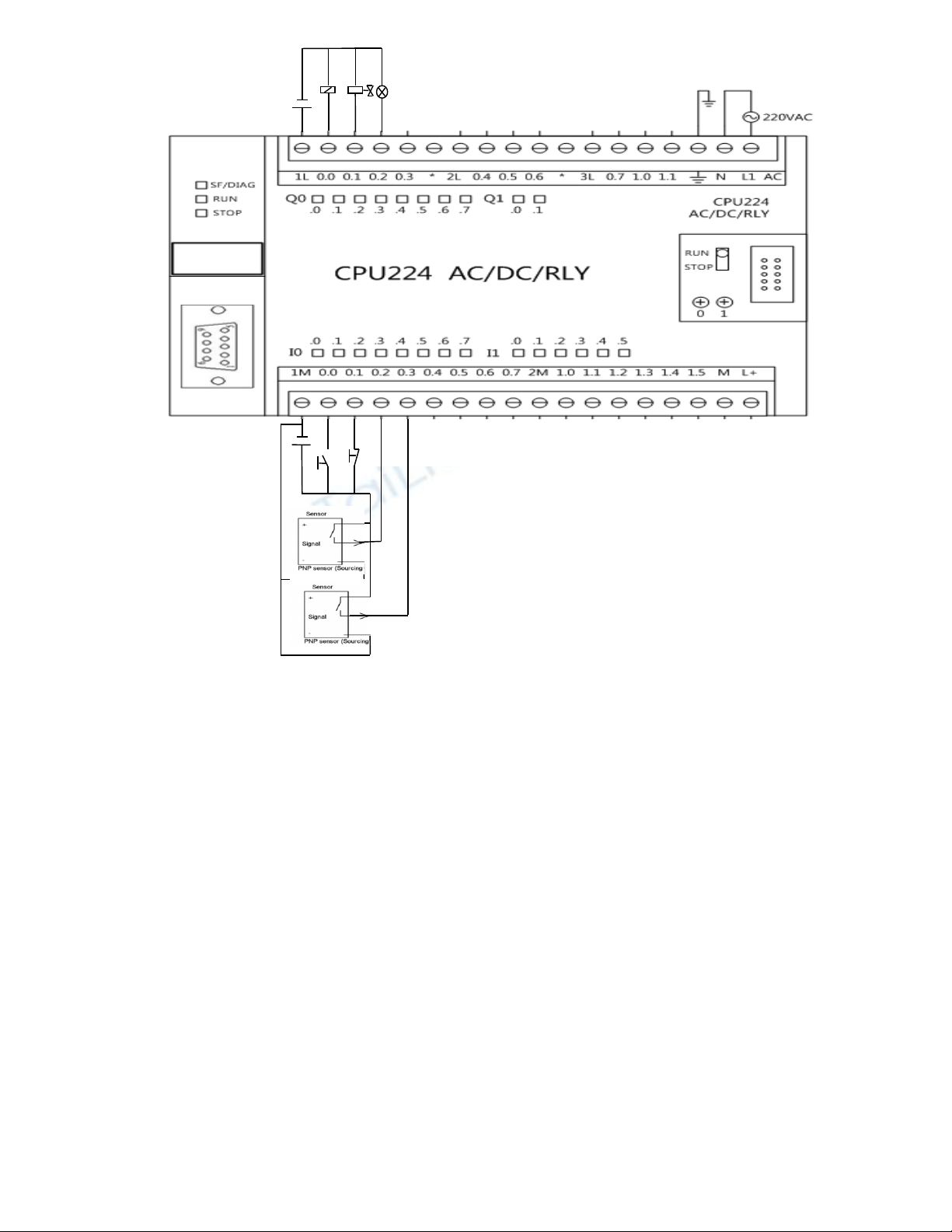 Vẽ mạch điện kết nối bộ điều khiển PLC S7-200 CPU224 AC/DC/RLY với các thiết bị ở trên.