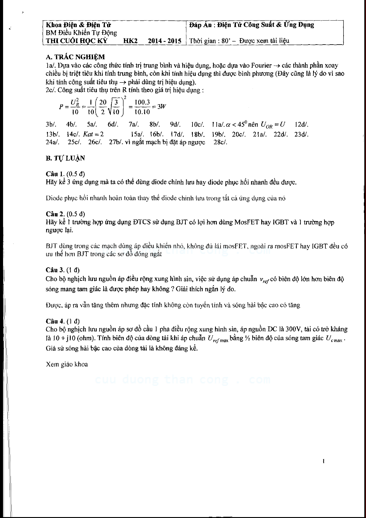 Đáp án đề thi Điện tử công suất và ứng dụng