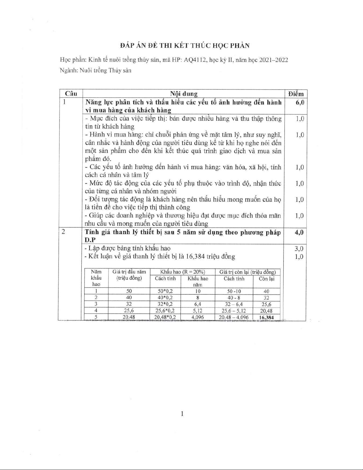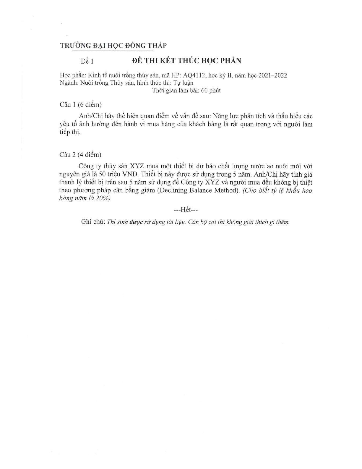 Đáp án đề thi kết thúc học phần học kì 2 môn Kinh tế nuôi trồng thủy sản năm 2021-2022 có đáp án - Trường ĐH Đồng Tháp