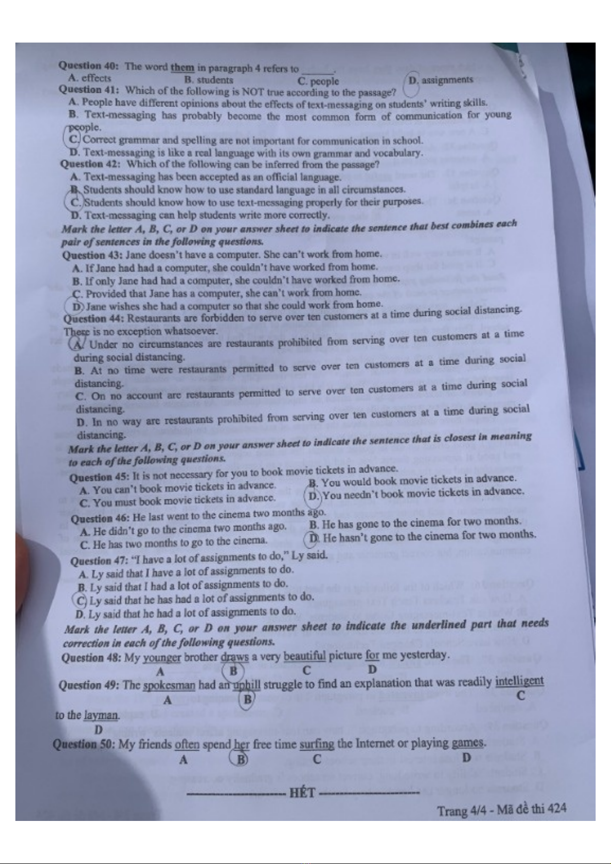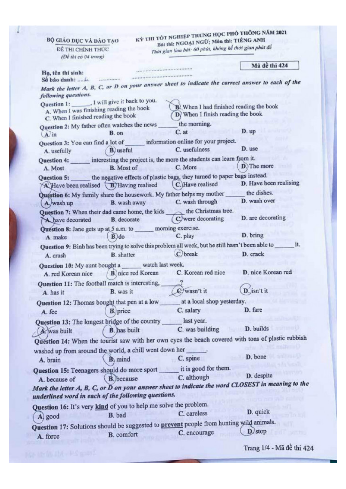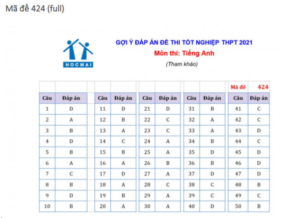 TaiLieu.VN giới thiệu đến bạn Đáp án đề thi THPT Quốc gia năm 2021 môn Tiếng Anh nhằm giúp các em học sinh có tài liệu ôn tập, luyện tập nhằm nắm vững được những kiến thức ngữ pháp, kĩ năng cơ bản, đồng thời vận dụng kiến thức để giải các bài tập Tiếng Anh một cách thuận lợi. Chúc các em thi tốt!