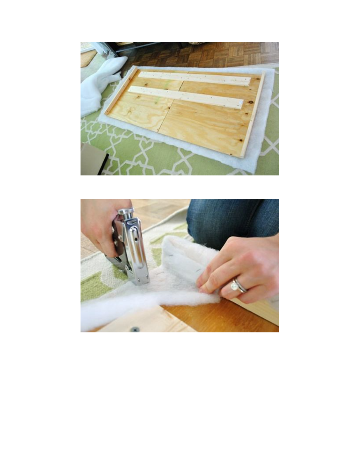 Sử dụng dập ghim hoặc đinh nhỏ để viền vải bông lót cho thanh chắn giường.