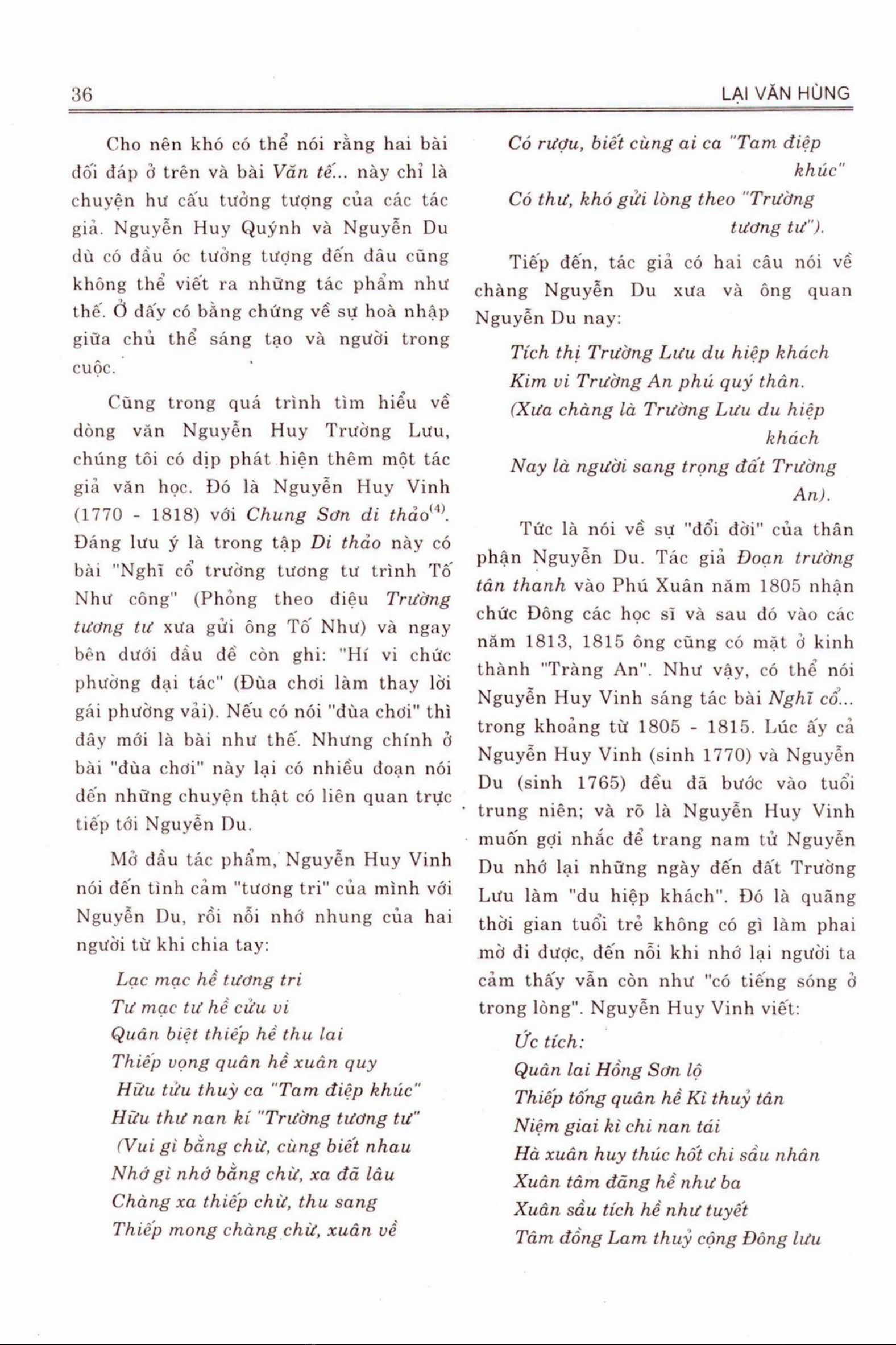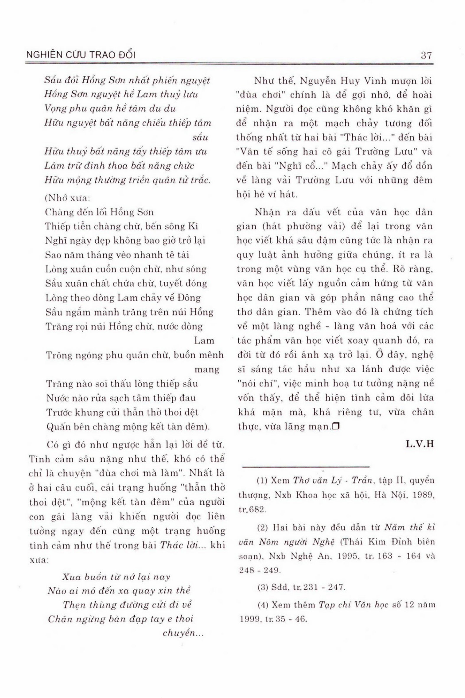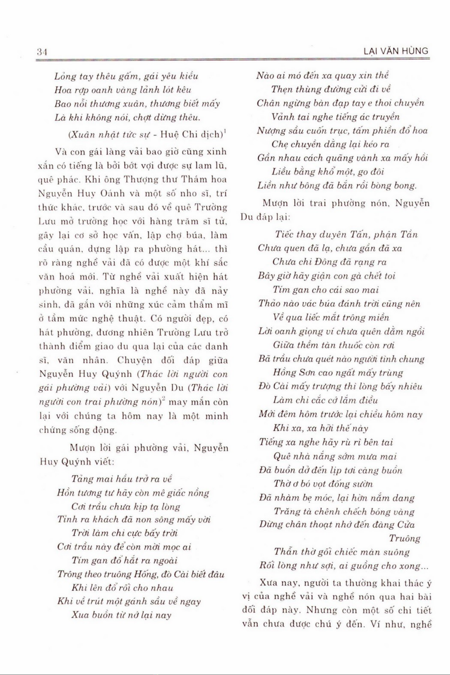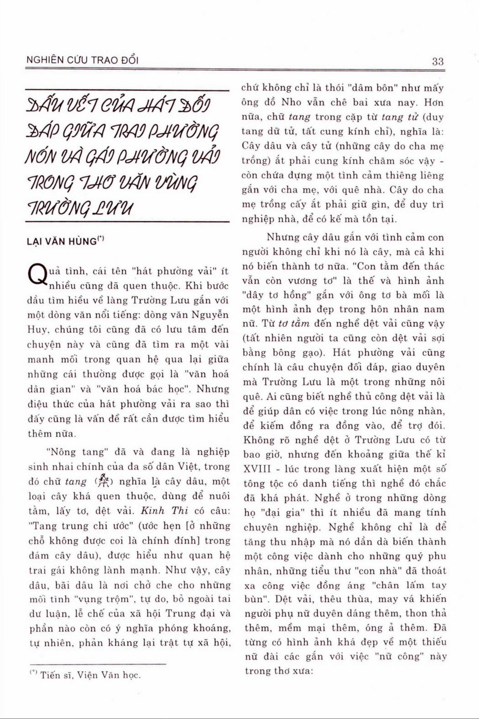 Thực tế hát đối đáp giữa trai phường Nón và gái phưòng Vải ở khu vực Trường Lưu có nhiều tham gia, và các tác phẩm thơ văn của vùng này đã giữ lại những dấu vết thú vị của chúng. Bài viết tìm hiểu hoạt động hát đối đáp này trong các sáng tác văn học, khám phá cách thức thể hiện và nội dung của chúng, và từ đó sẽ báo cáo về nét đặc sắc về văn hóa và đời sống xã hội của khu vực Trường Lưu.