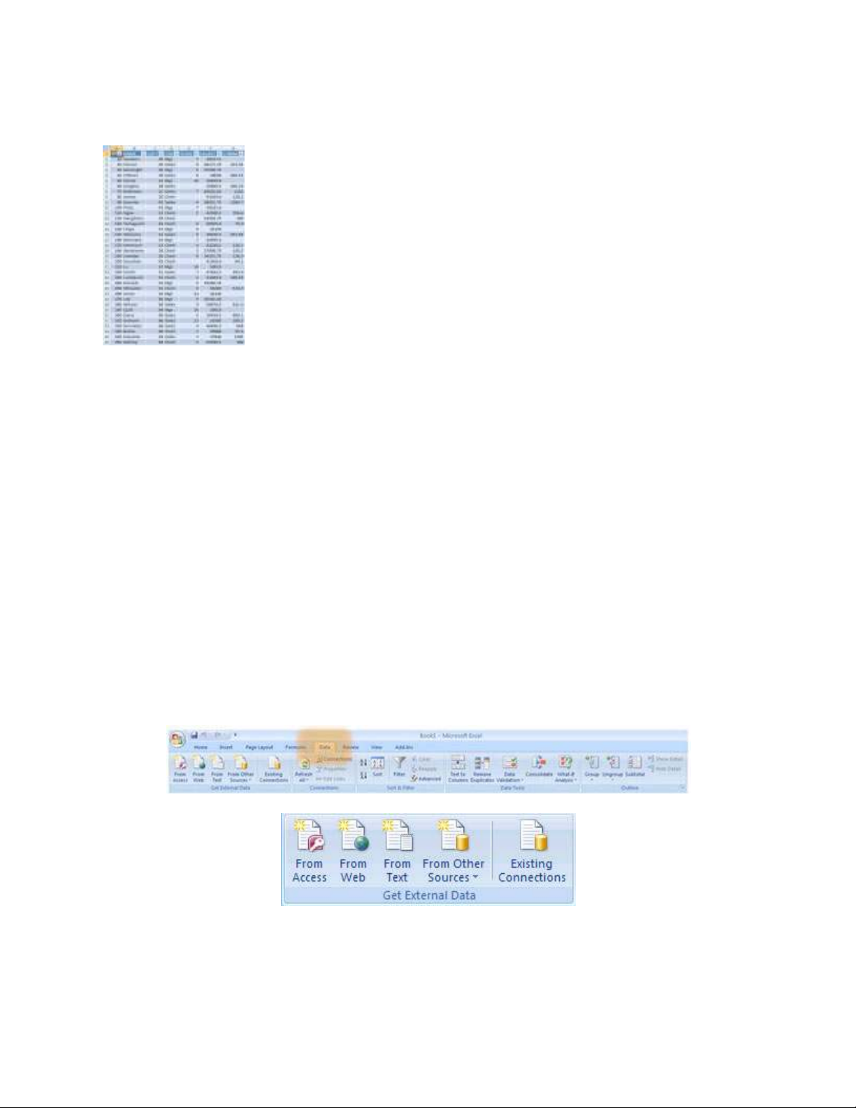 Như ở hình trên bạn có thể thấy, Excel 2007 hỗ trợ nhập dữ liệu từ nhiều nguồn khác nhau (file