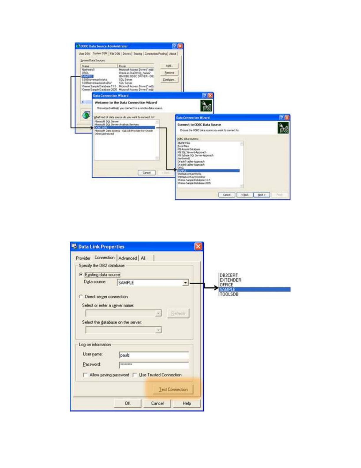 Data Source (ODBC). Cơ sở dữ liệu mẫu SAMPLE của tôi được cấu hình là một file DSN hệ