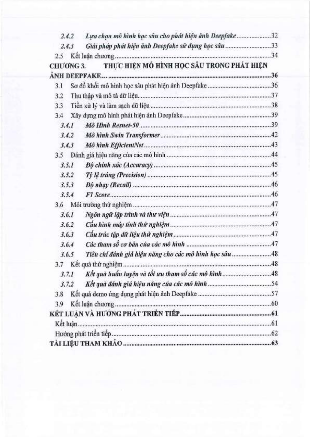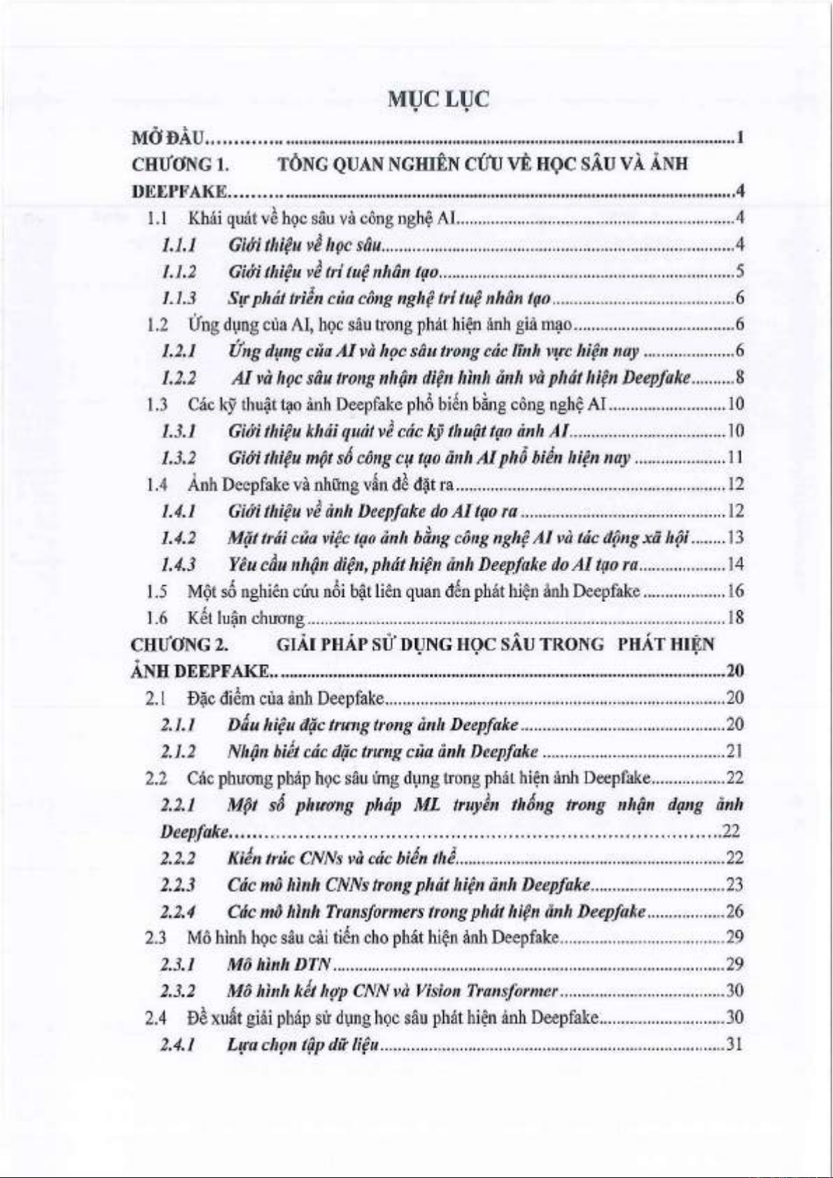 Sự phát triển mạnh mẽ của trí tuệ nhân tạo (AI) và học sâu (Deep Learning) đã mở ra kỷ nguyên mới cho thị giác máy tính, nhưng đồng thời cũng kéo theo những thách thức phức tạp. Nổi bật trong số đó là công nghệ Deepfake, có khả năng tạo ra hình ảnh và video giả mạo với độ chân thực đáng kinh ngạc, gây khó khăn trong việc phân biệt với nội dung thật. Tình trạng này đặt ra những mối đe dọa nghiêm trọng về an ninh thông tin, quyền riêng tư, và tiềm ẩn nguy cơ lừa đảo, phát tán tin giả. Trước bối cảnh đó, việc nghiên cứu và ứng dụng các phương pháp hiệu quả để phát hiện ảnh Deepfake trở thành yêu cầu cấp thiết, nhằm bảo vệ tính xác thực của thông tin số và giảm thiểu tác động tiêu cực của công nghệ này.