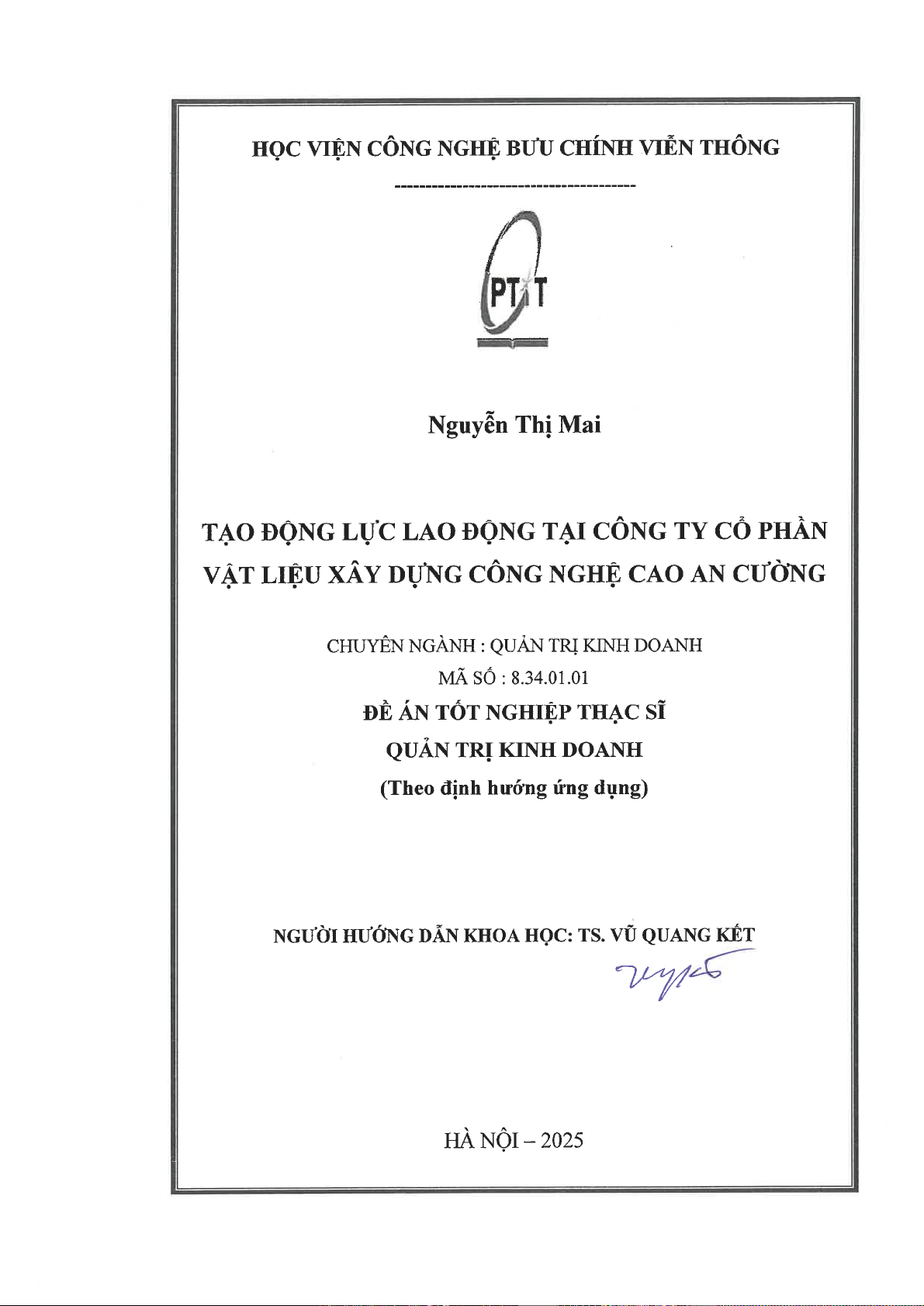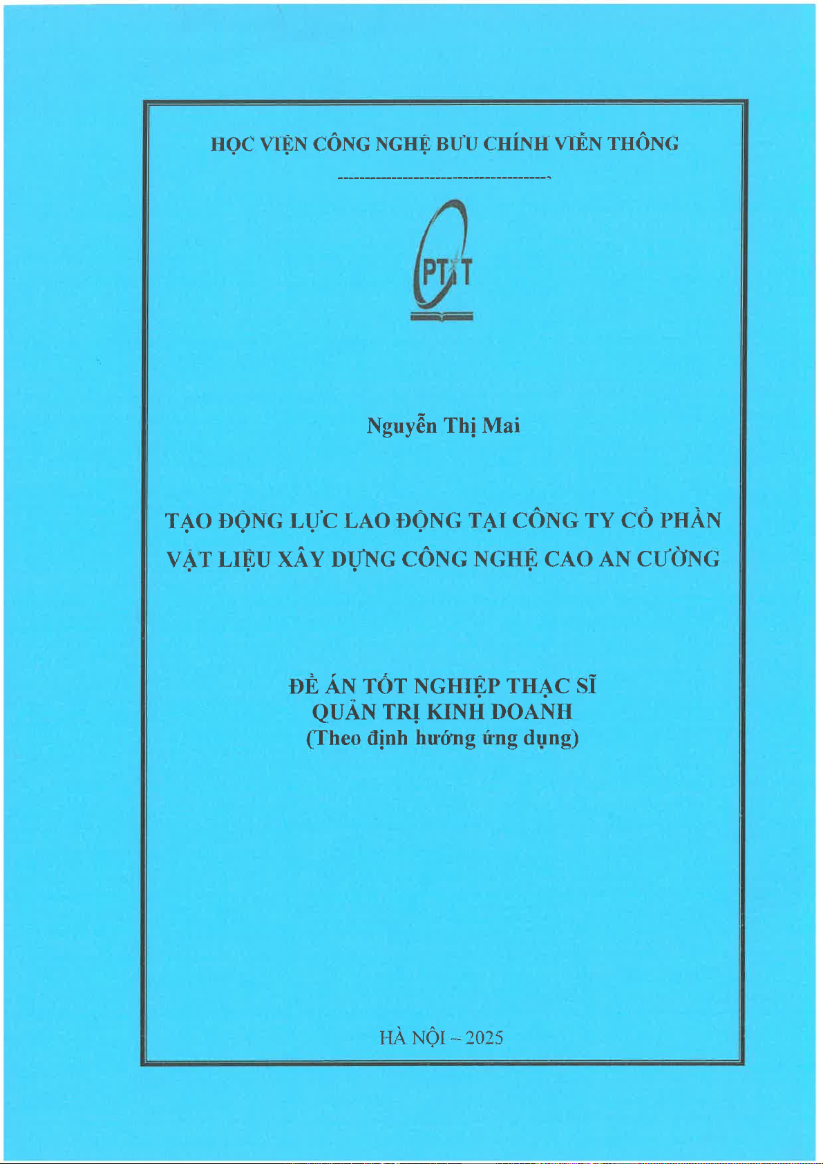Đề án này tập trung nghiên cứu và đề xuất các giải pháp nhằm hoàn thiện công tác tạo động lực lao động tại Công ty Cổ phần Vật liệu Xây dựng Công nghệ cao An Cường. Bắt đầu bằng việc hệ thống hóa các lý luận cơ bản về động lực lao động, bao gồm các khái niệm về nhu cầu, động cơ và ứng dụng các học thuyết nổi bật như Tháp nhu cầu của Abraham Maslow và Học thuyết tăng cường tích cực của B.F. Skinner, nghiên cứu cung cấp một nền tảng lý thuyết vững chắc. Phương pháp nghiên cứu bao gồm thu thập dữ liệu thứ cấp từ các báo cáo nội bộ và ngành, cùng với dữ liệu sơ cấp thông qua khảo sát định lượng chi tiết trên 156 nhân viên tại các bộ phận sản xuất, văn phòng, kỹ thuật và kinh doanh của công ty trong giai đoạn 2021-2024. Kết quả khảo sát cho thấy, các yếu tố như thu nhập, ổn định tài chính và sự công nhận thành tích đóng vai trò quan trọng trong việc tạo động lực. Dựa trên phân tích thực trạng và các hạn chế hiện có, đề án đề xuất các giải pháp cụ thể nhằm tối ưu hóa các chính sách kích thích tài chính và phi tài chính, cải thiện môi trường làm việc và cơ hội thăng tiến. Mục tiêu cuối cùng là nâng cao năng suất lao động, giảm tỷ lệ nghỉ việc, và xây dựng một đội ngũ nhân viên gắn bó, sáng tạo, góp phần vào sự phát triển bền vững và tăng trưởng giá trị cho Công ty An Cường.