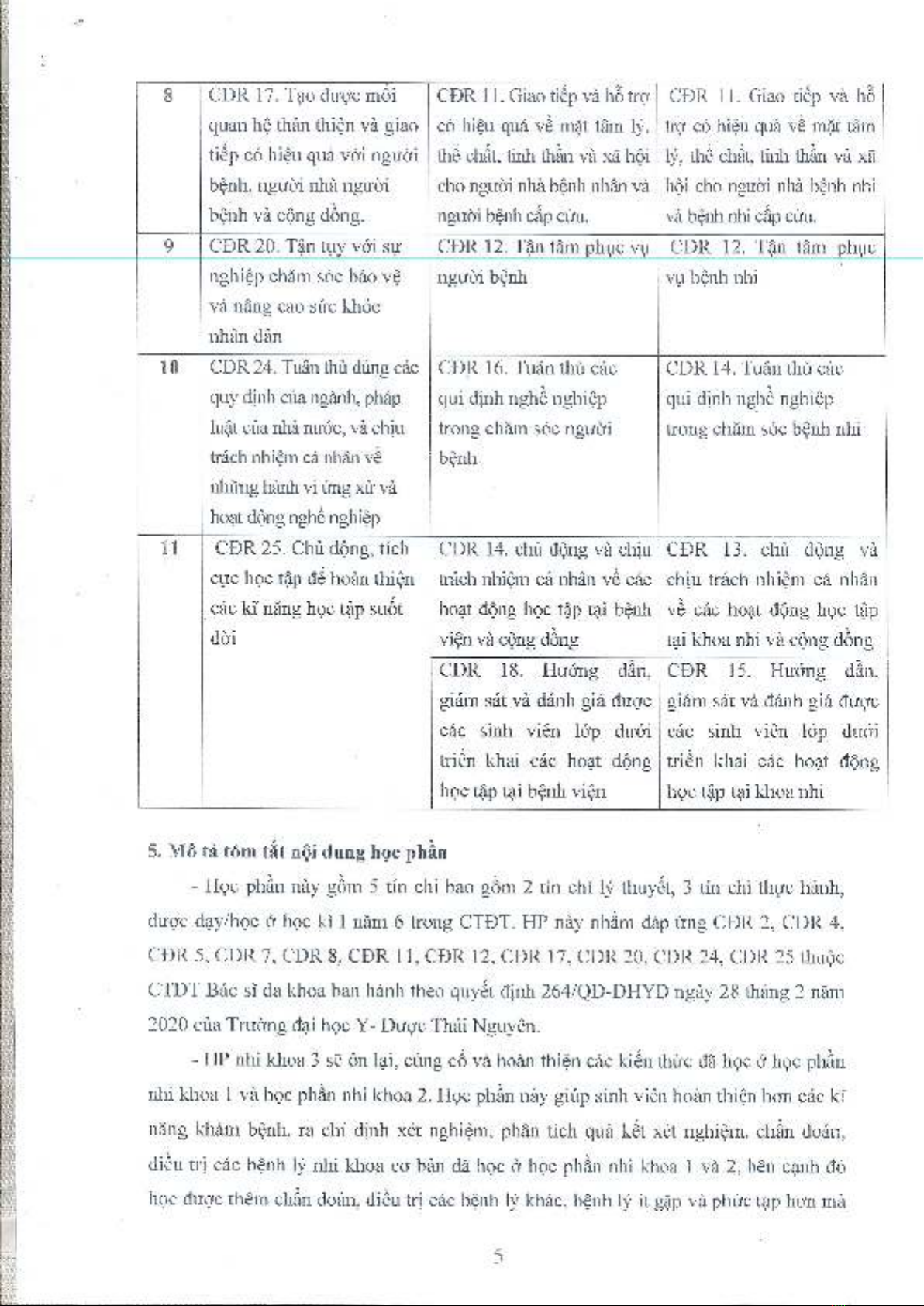 Học phần này cung cấp kiến thức về cách phân tích kết quả xét nghiệm, ra chỉ định xét nghiệm, chẩn đoán và điều trị các bệnh lý nhi khoa khác nhau. Sinh viên sẽ được huấn luyện để có thể áp dụng các kĩ năng khám bệnh, chẩn đoán và điều trị vào thực tiễn y tế. Học phần Nhi khoa 3 cho phép sinh viên hoàn thiện các kĩ năng khám bệnh, ra chỉ định xét nghiệm, phân tích quả kết xét nghiệm, chẩn đoán và điều trị các bệnh lý nhi khoa cơ bản đã học ở học phần Nhi khoa 1 và 2, bên cạnh đó học được thêm chẩn đoán, điều trị các bệnh lý khác, bệnh lý ít gặp và phức tạp hơn mà các học phần trước chưa được học.