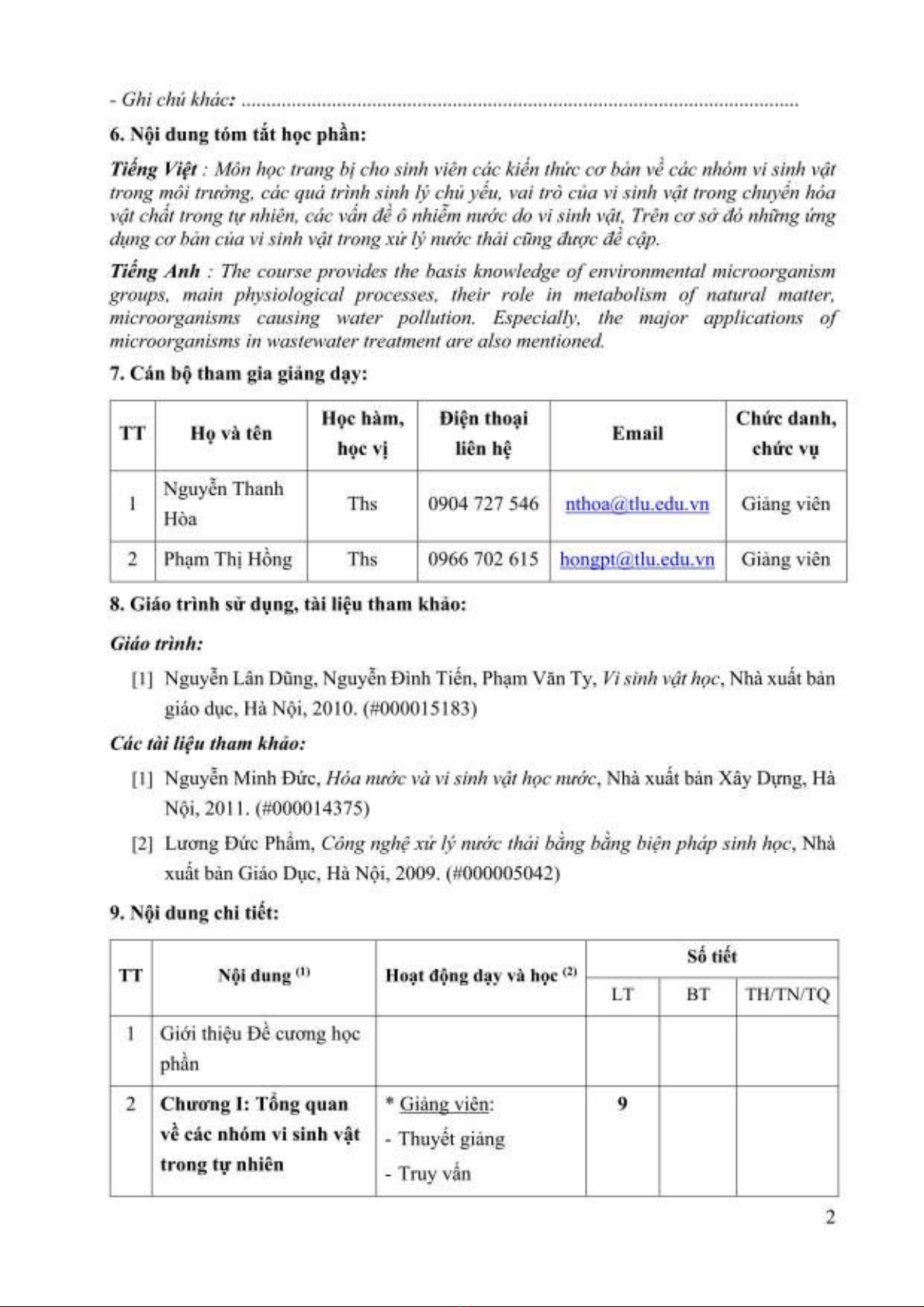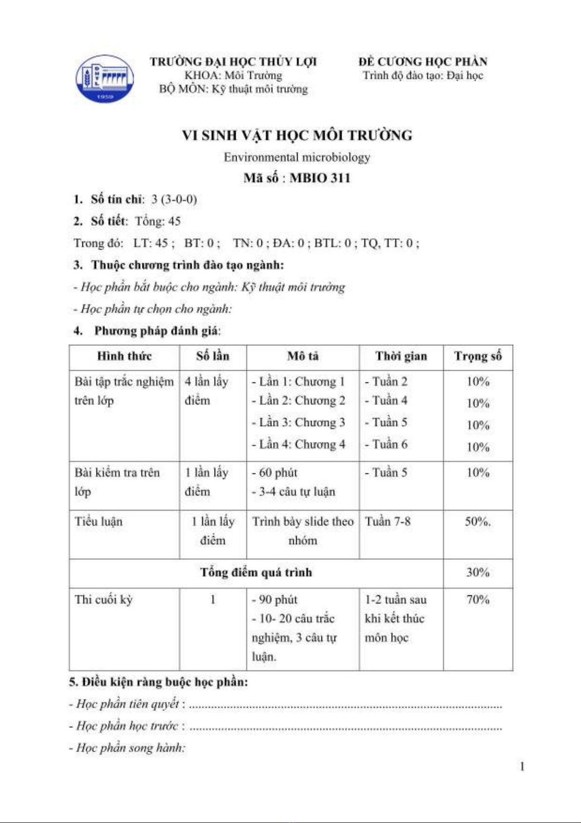 Đề cương học phần Vi sinh vật học môi trường - ĐH Thuỷ Lợi