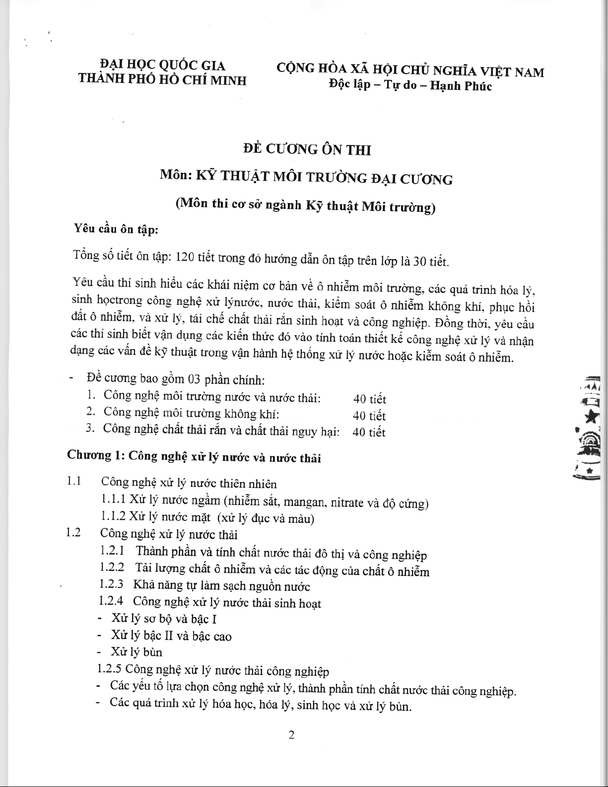 Đê cương chi tiết môn thi cơ sở môn Kỹ thuật môi trường đại cương (Dùng cho tuyển sinh trình độ Thạc sỹ) - ĐH Quốc gia TP Hồ Chí Minh