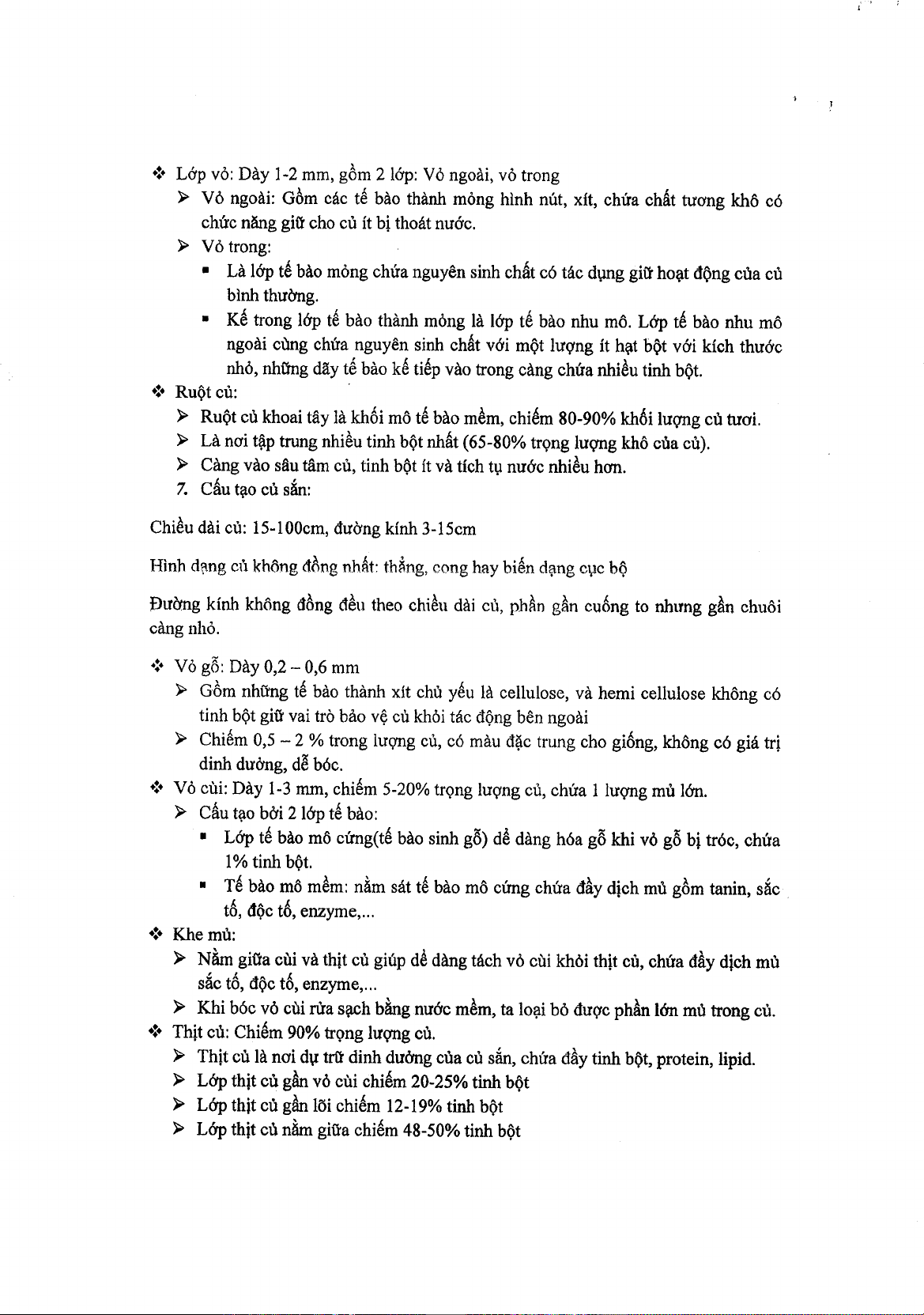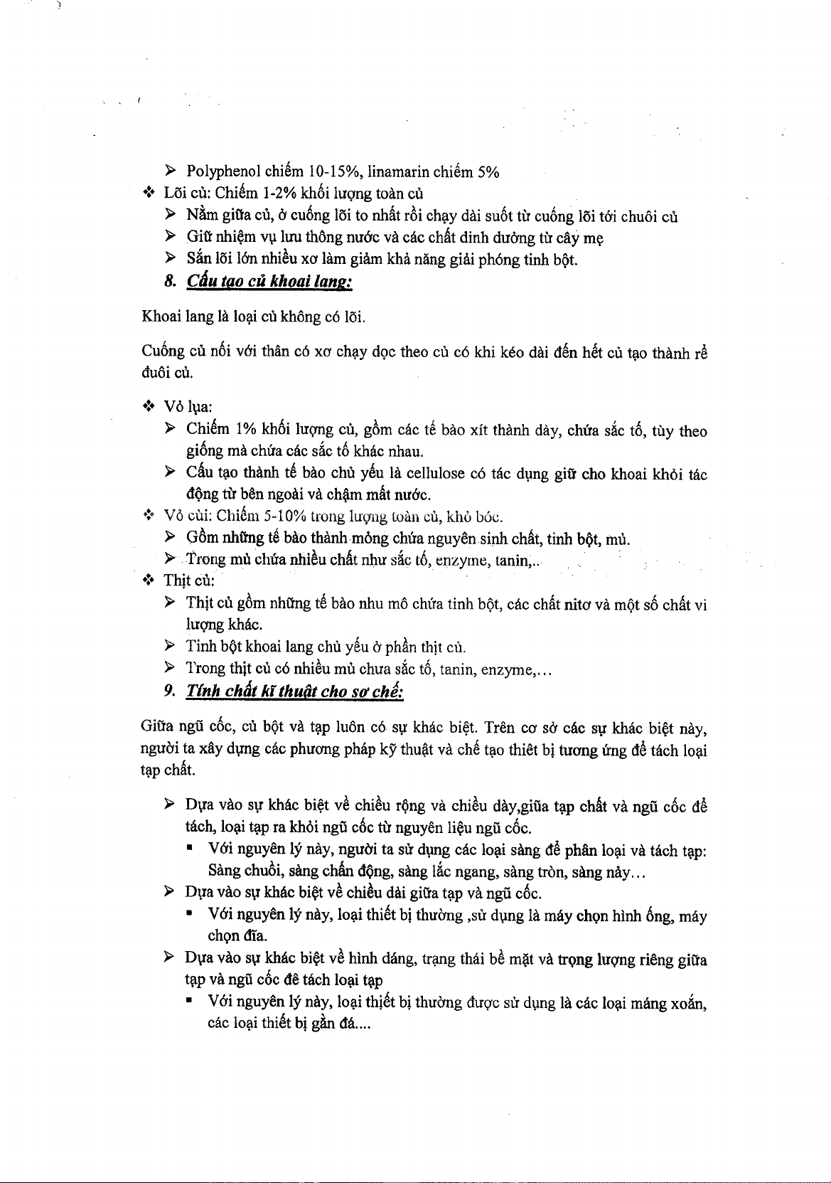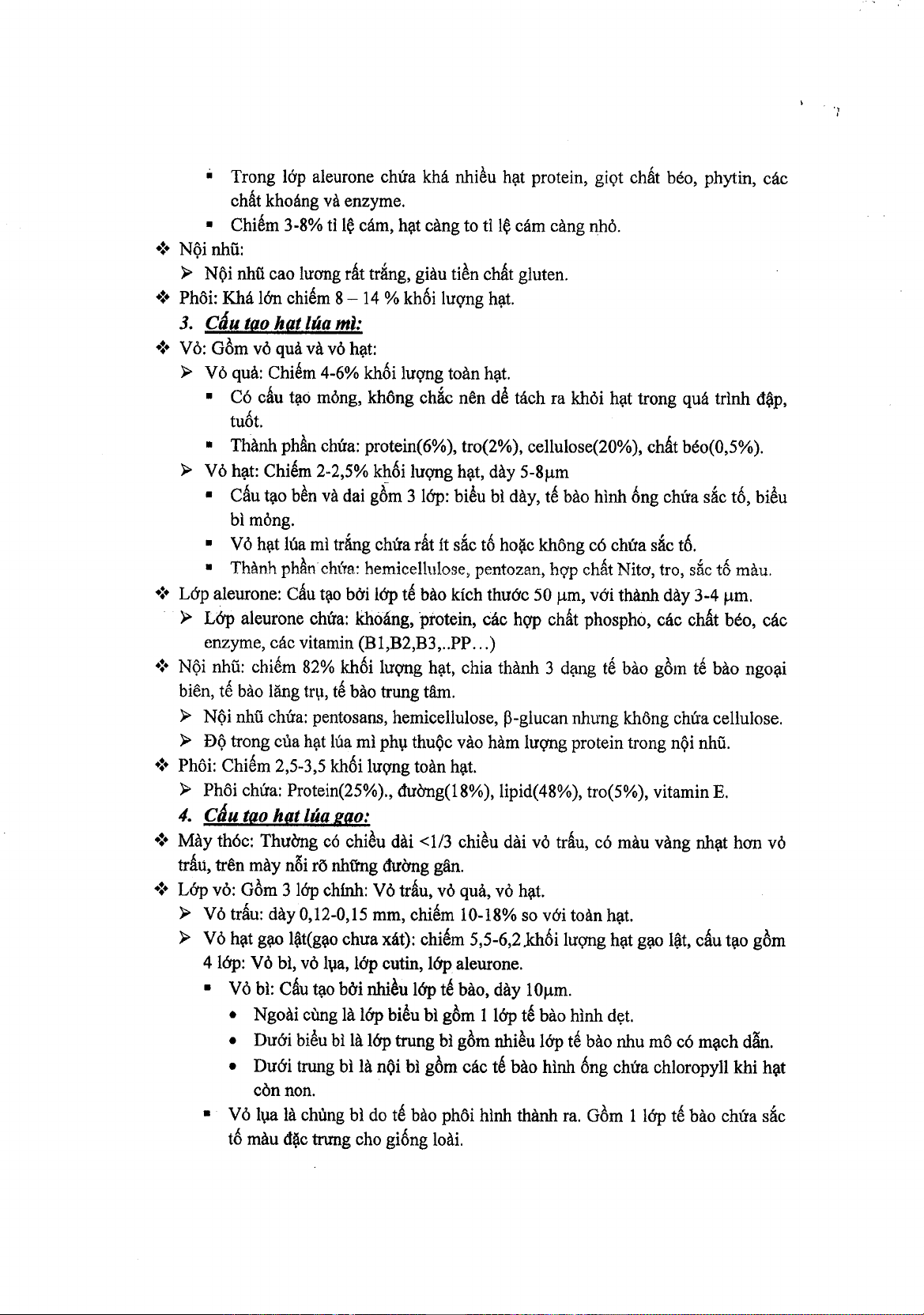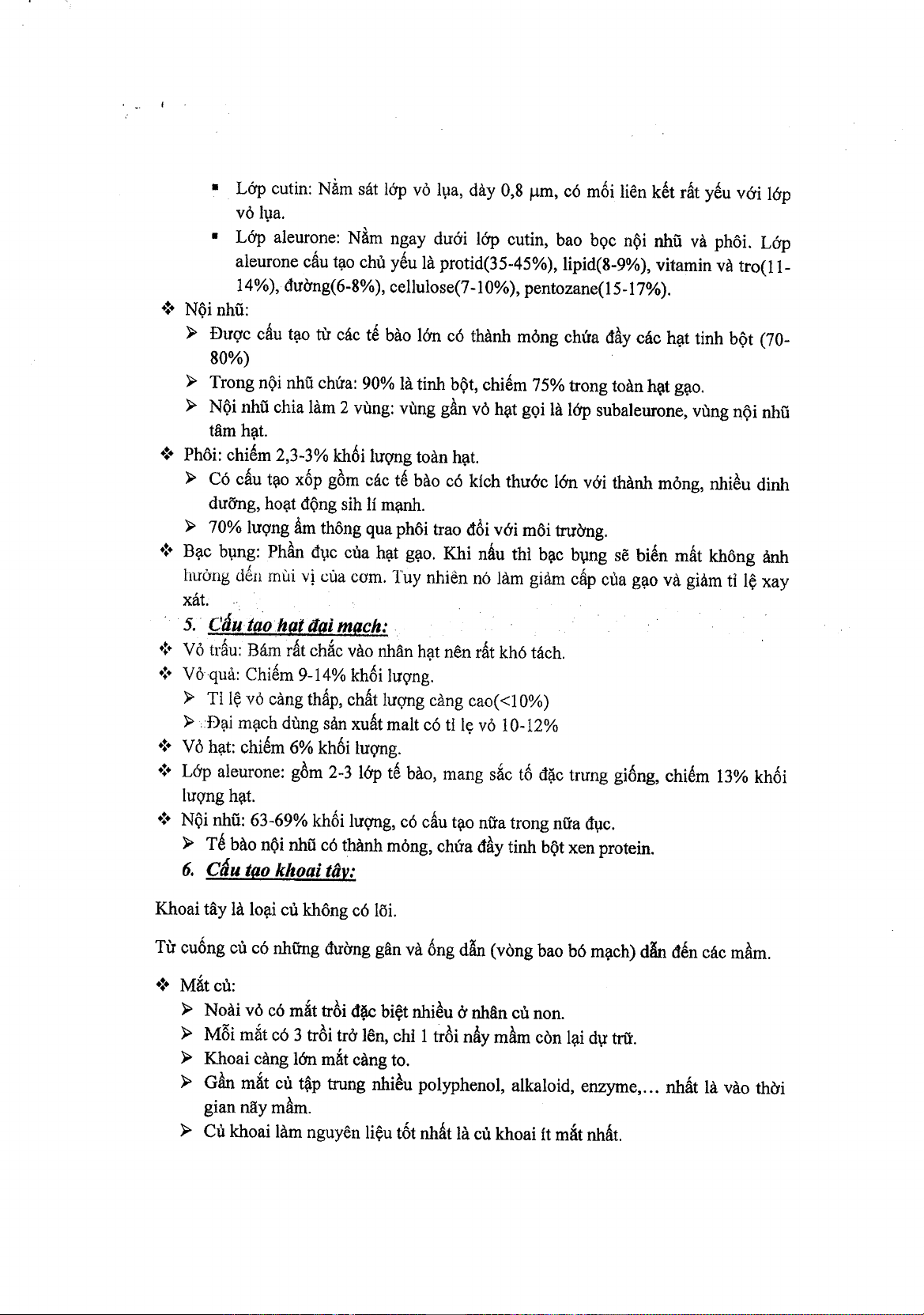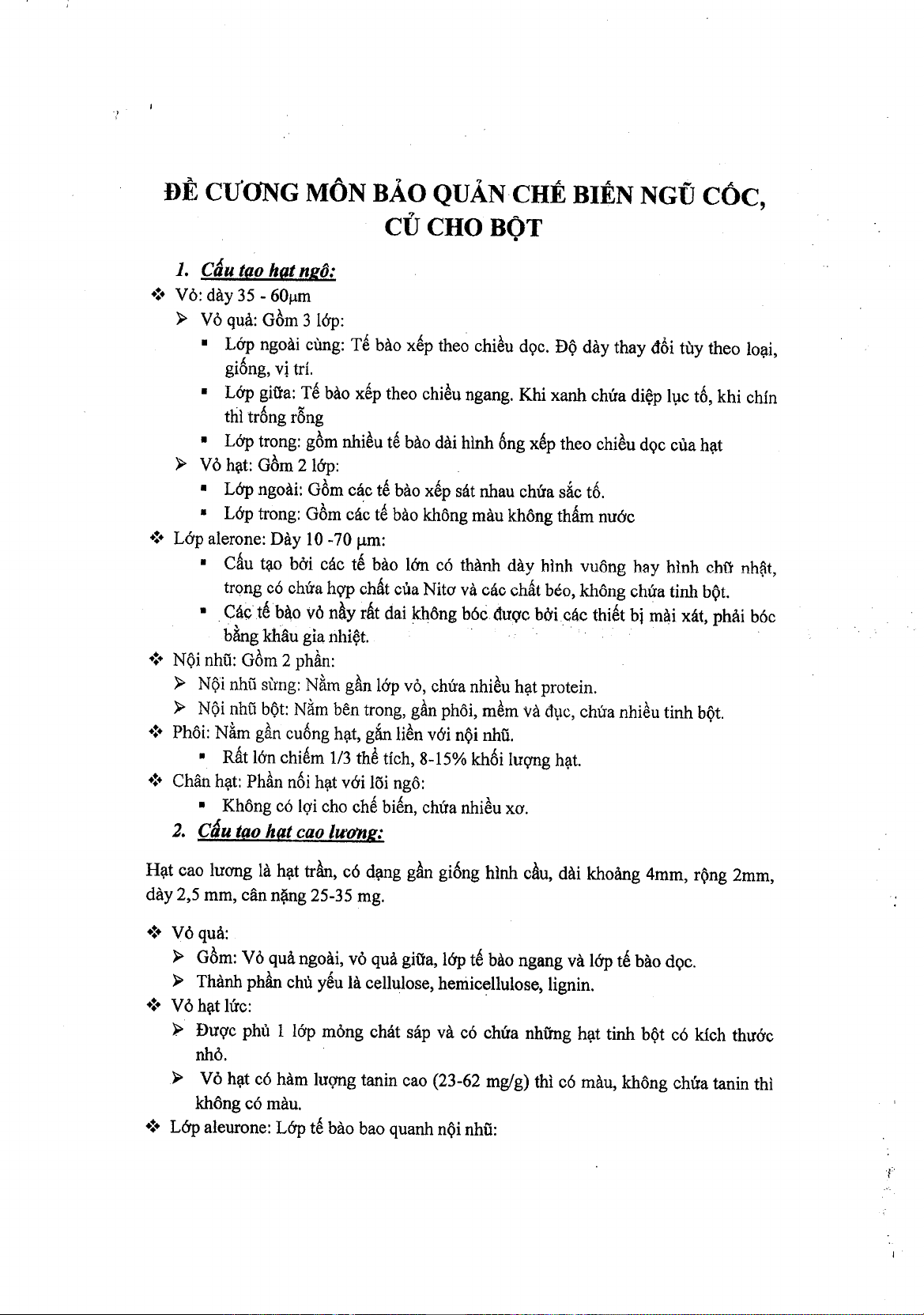 Tài liệu này cung cấp một đề cương chi tiết về cấu tạo của các loại ngũ cốc và củ thường dùng để chế biến bột, tập trung vào các đặc điểm quan trọng cho công nghệ bảo quản và chế biến. Nội dung bắt đầu với việc mô tả cấu trúc hạt ngô, phân tích các lớp vỏ, nội nhũ và phôi, cùng các thành phần hóa học đặc trưng. Tiếp theo là hạt cao lương, với hình dạng và cấu trúc vỏ tương tự, nhấn mạnh hàm lượng tannin. Cấu tạo hạt lúa mì và lúa gạo cũng được trình bày kỹ lưỡng, đặc biệt là các lớp vỏ, aleurone và nội nhũ, vốn ảnh hưởng trực tiếp đến quy trình xay xát và chất lượng bột. Đối với các loại củ bột như khoai tây, sắn và khoai lang, tài liệu đi sâu vào cấu trúc vỏ, ruột củ, lõi và các tế bào mô, làm nổi bật vai trò của chúng trong việc giữ nước, dinh dưỡng và các hợp chất có hoạt tính sinh học. Phần cuối cùng thảo luận về các tính chất kỹ thuật quan trọng cho sơ chế, bao gồm các nguyên lý tách tạp dựa trên sự khác biệt về chiều rộng, chiều dài, tỷ trọng và từ tính, cùng khả năng biến hình của ngũ cốc và củ trong quá trình chế biến, từ đó làm thay đổi tính chất và giá trị sử dụng. Các thông tin này rất hữu ích để tối ưu hóa công nghệ bảo quản, chế biến ngũ cốc và củ cho bột.