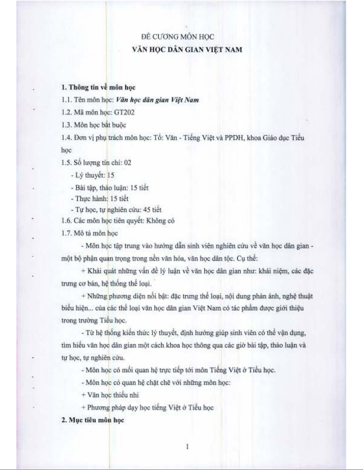 Đề cương trình bày khái quát, giới thiệu môn học, các mục tiêu, nội dung môn học cho các bạn dễ dàng theo dõi và nắm sơ lược về môn học Văn học dân gian Việt Nam. Mời các bạn cùng tham khảo đề cương để nắm rõ chi tiết nội dung.
