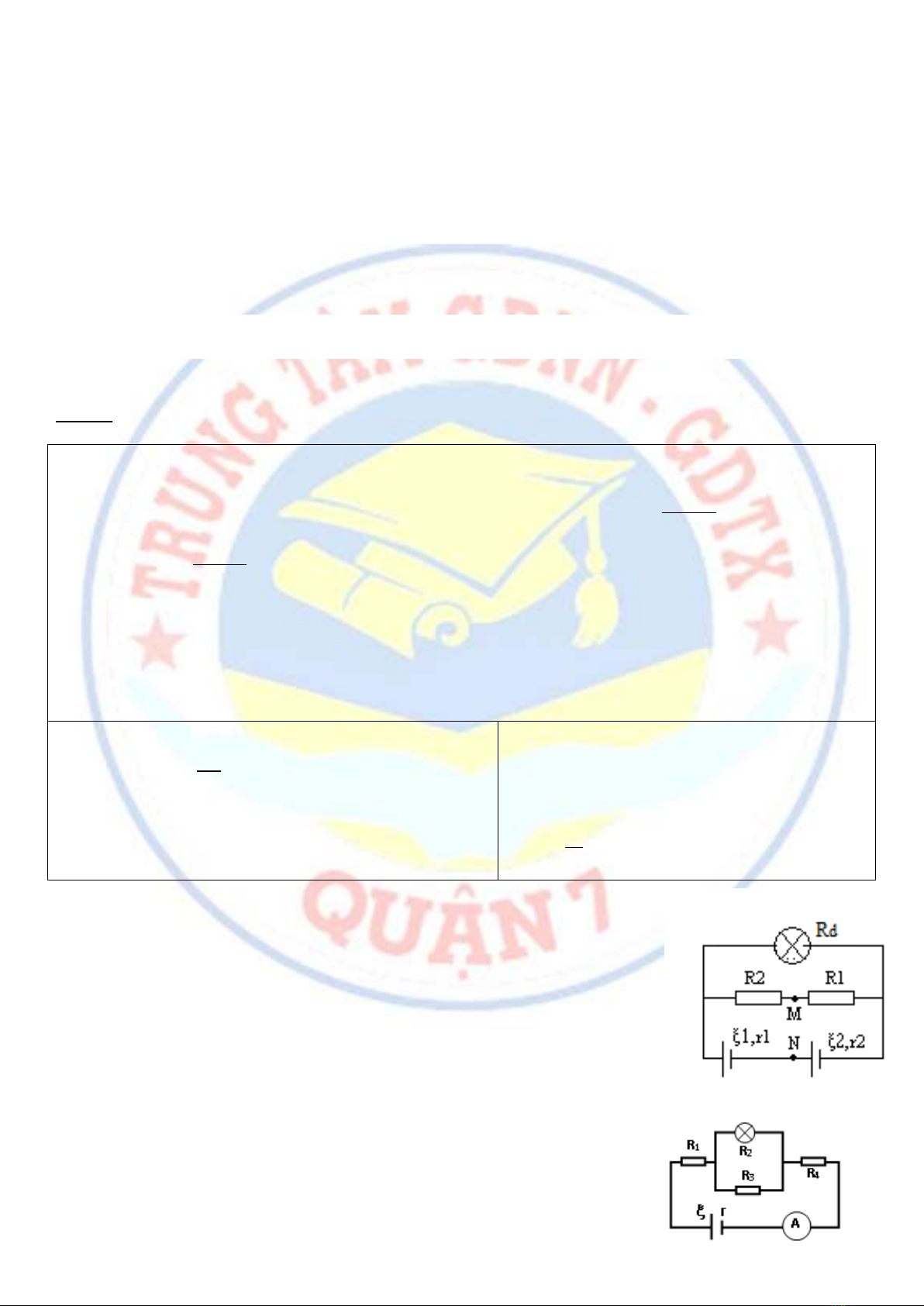 r1=1 Ω ,r2=2 Ω. Đèn Rd(6V-9W). Các điện trở R1=6 Ω, R2=12 Ω.