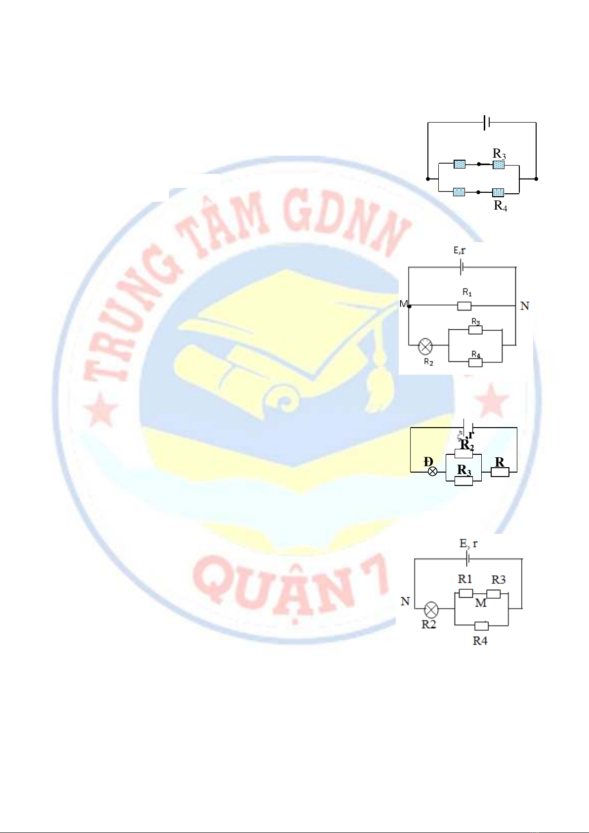 Bài 12. Cho mạch điện như hình vẽ,cho biết R1=3 Ω, R2=6 Ω, R3=7 Ω, R4=9 Ω,