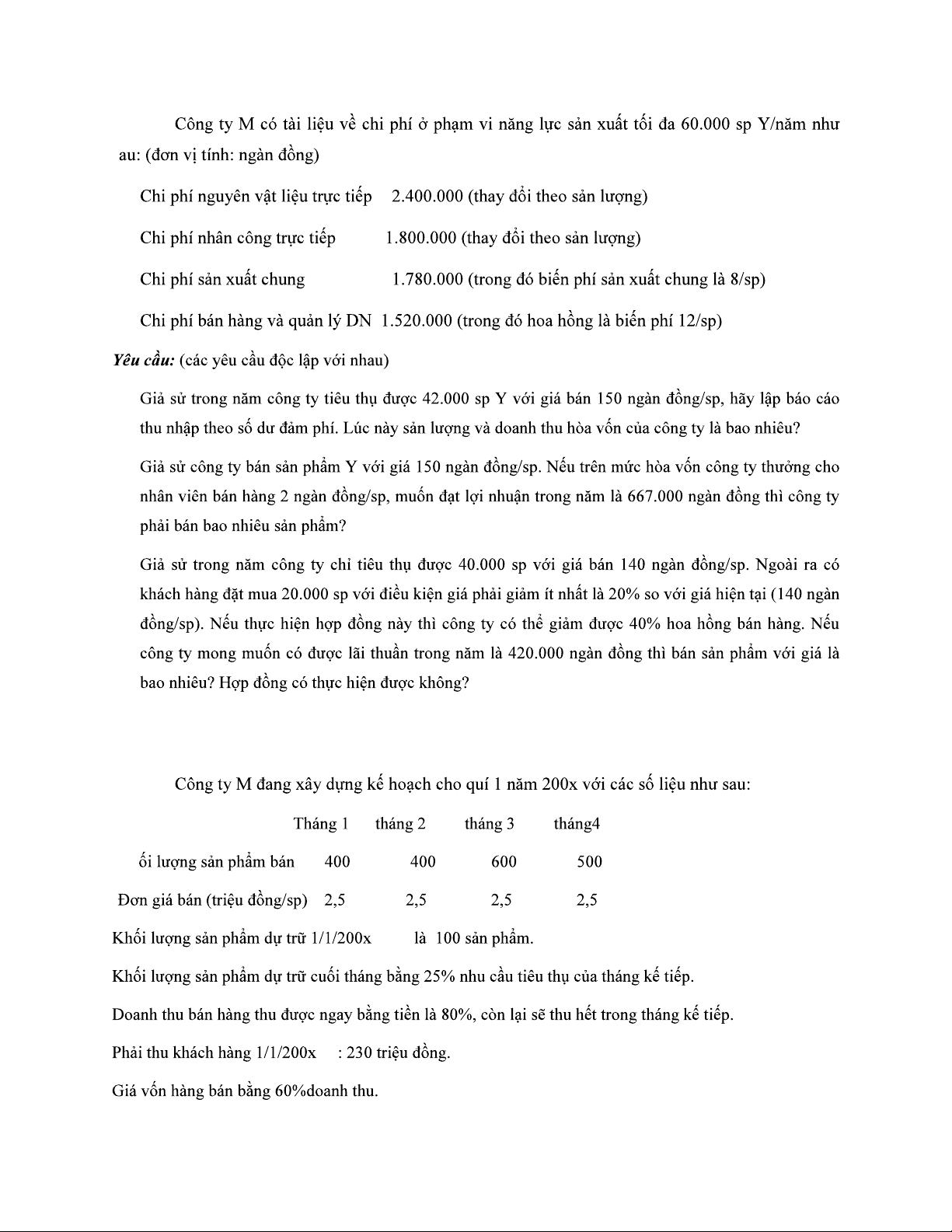 Bài 4: Tại một doanh nghiệp sản xuất sản phẩm A, dự kiến trong năm 20x5 có tài liệu sau :