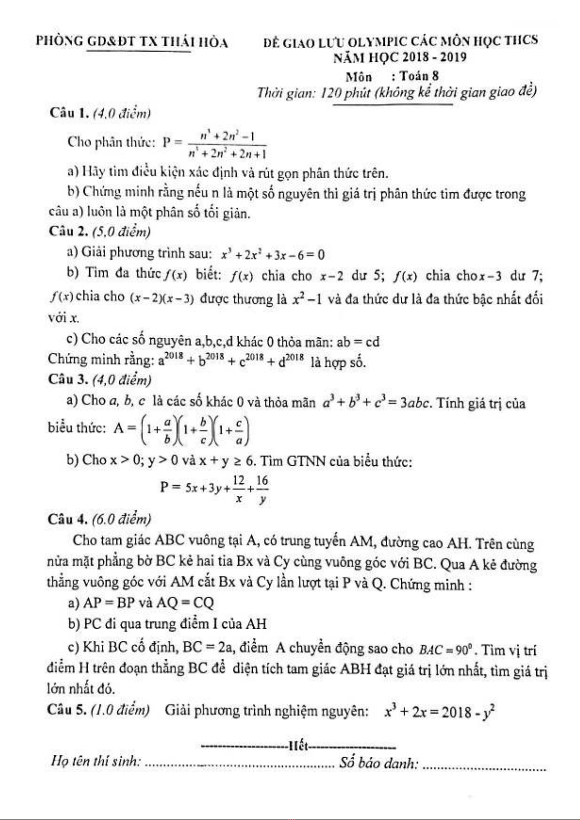 Đề giao lưu Olympic môn Toán 8 năm 2018-2019 - Phòng GD&ĐT Thị xã Thái Hòa