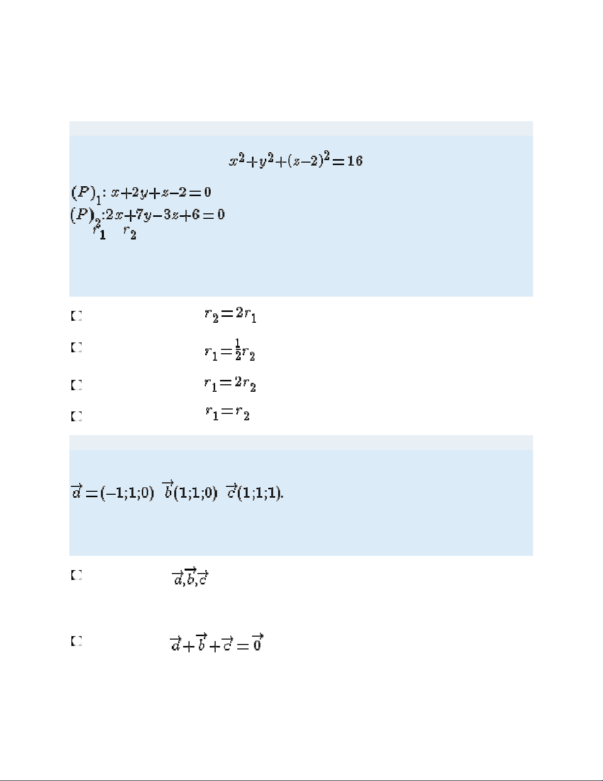 2y + 2z - 2 = 0 Gọi r1, r2 tương ứng là bán kính các đường tròn thiết diện của mặt cầu với