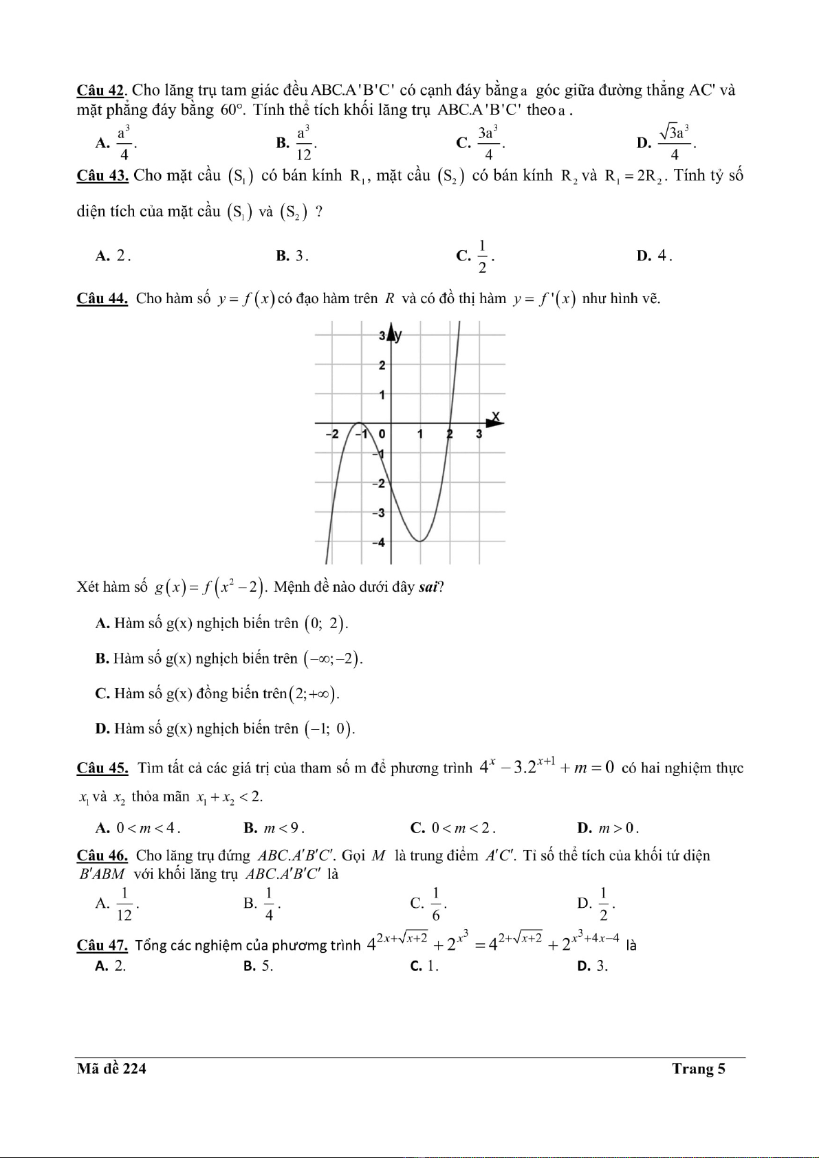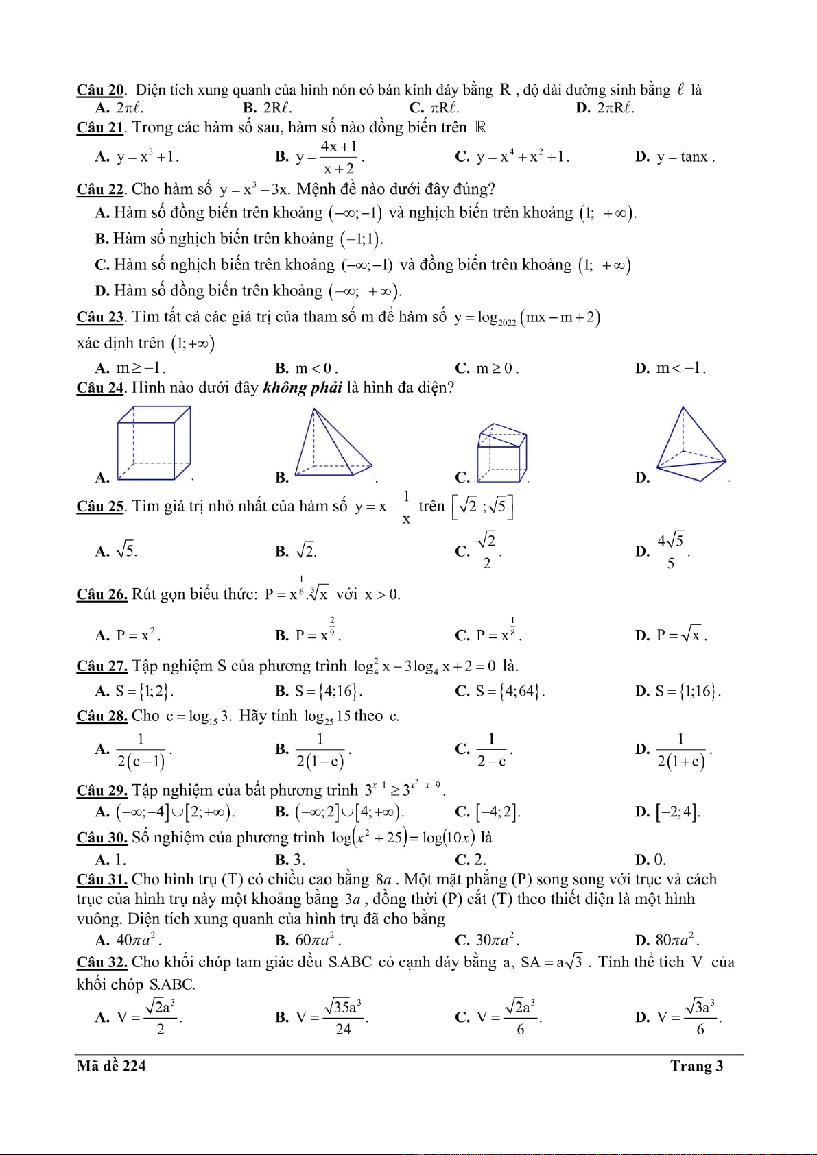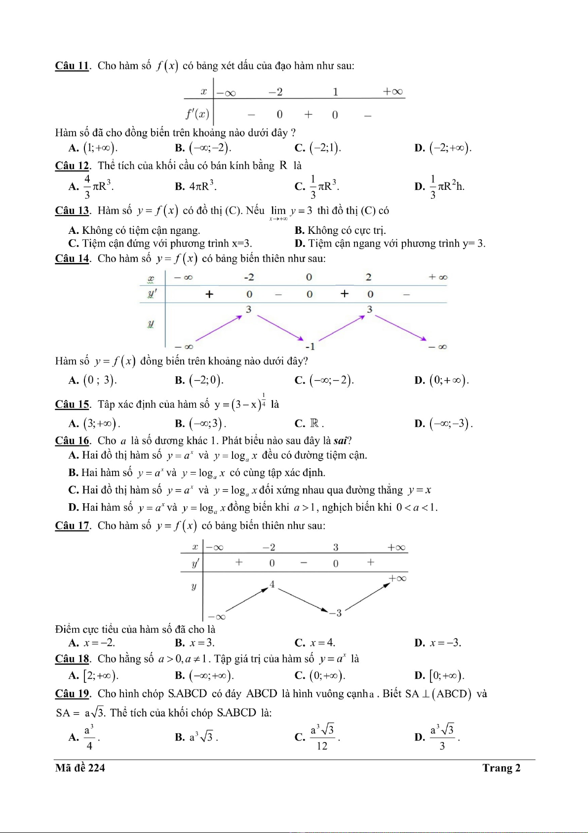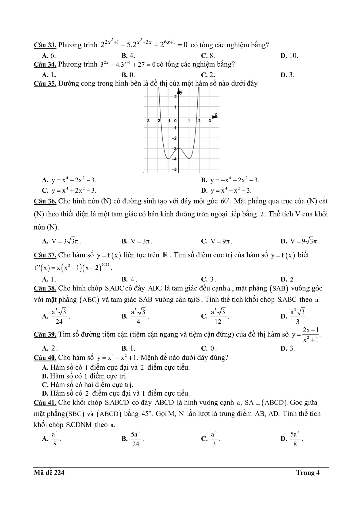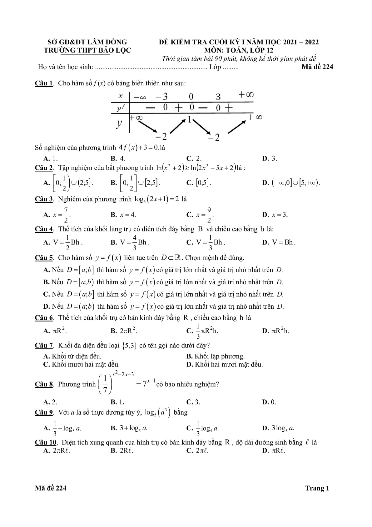 Đề kiểm tra cuối học kỳ 1 môn Toán lớp 12 năm 2021-2022 có đáp án - Trường THPT Bảo Lộc (Mã đề 224)