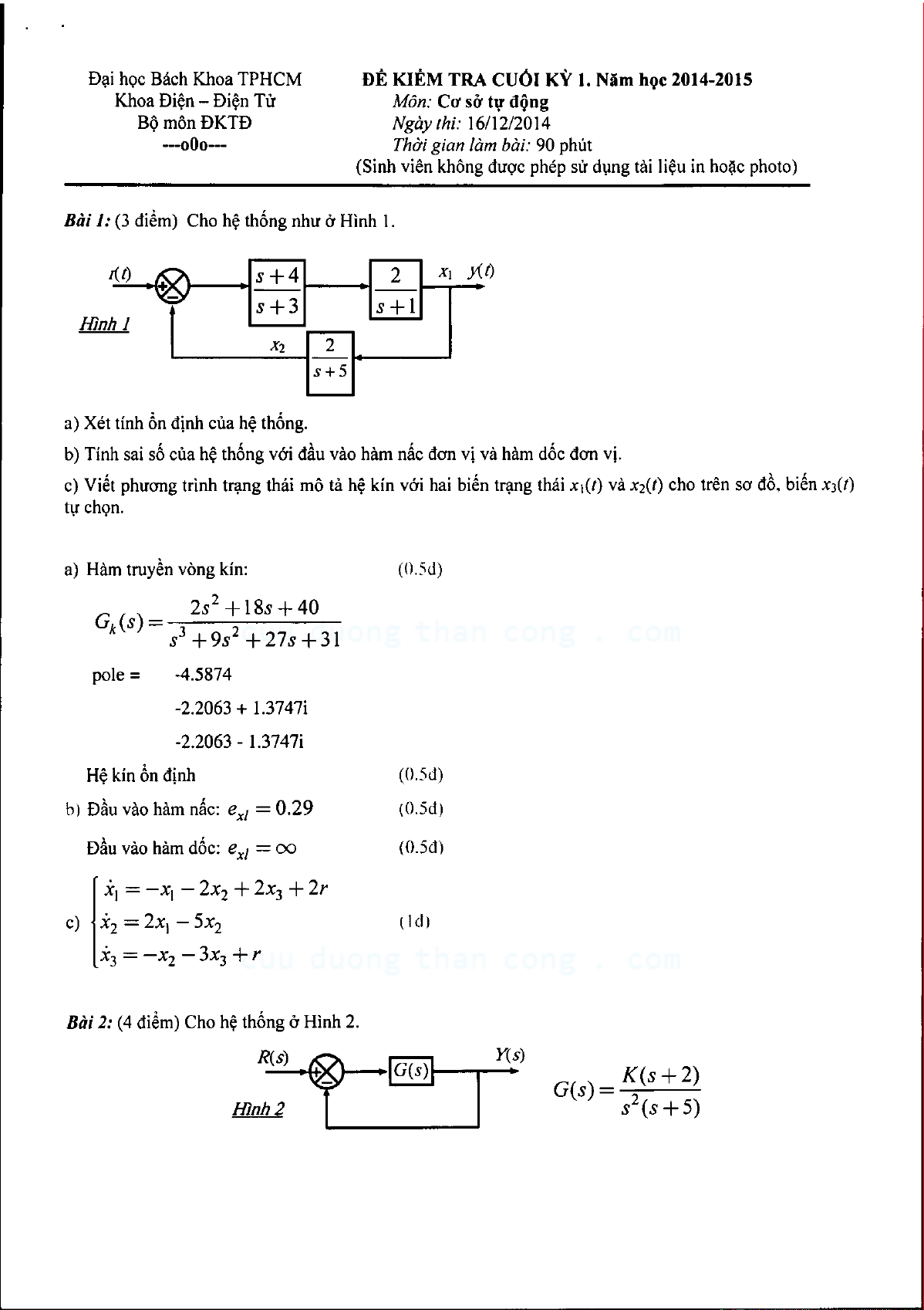 Đề kiểm tra cuối học kỳ 1 năm học 2014 - 2015 môn Cơ sở tự động