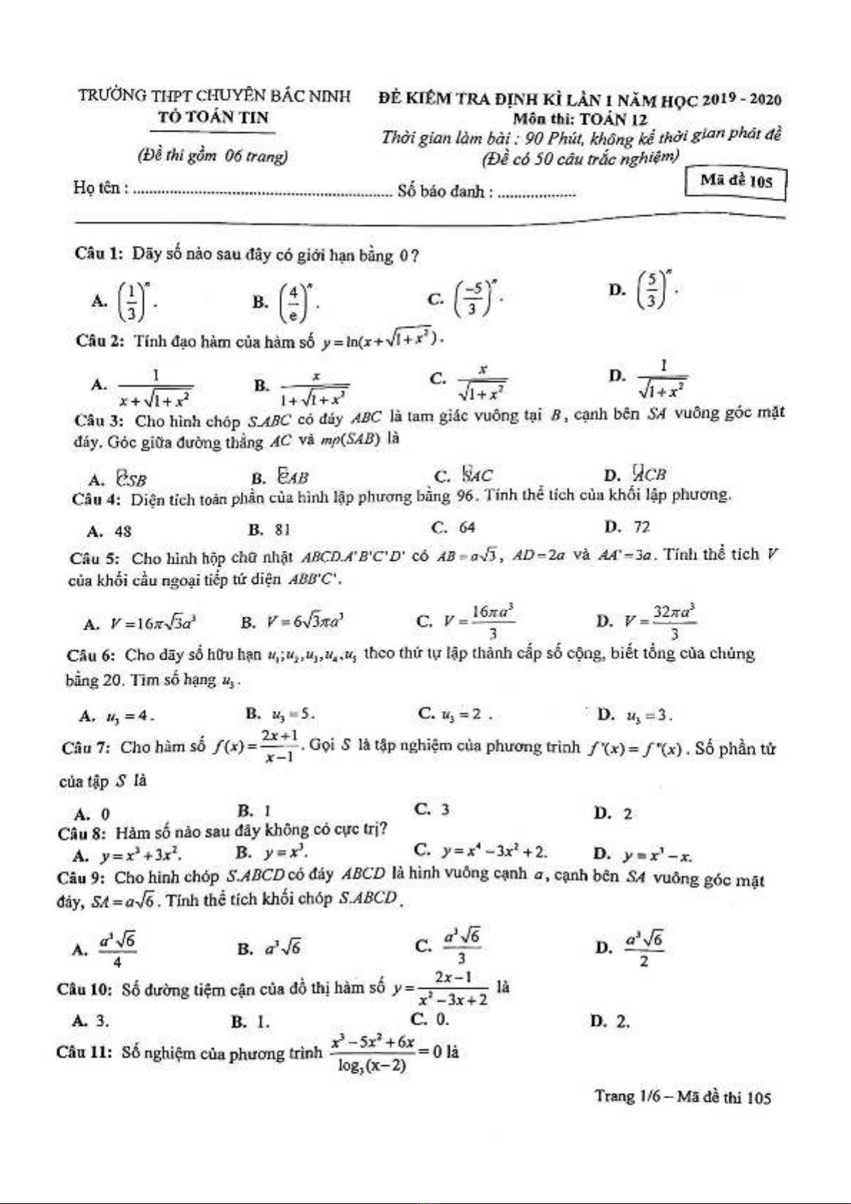 Đề kiểm tra định kỳ môn Toán 12 năm 2019-2020 có đáp án - Trường THPT chuyên Bắc Ninh (Lần 1)