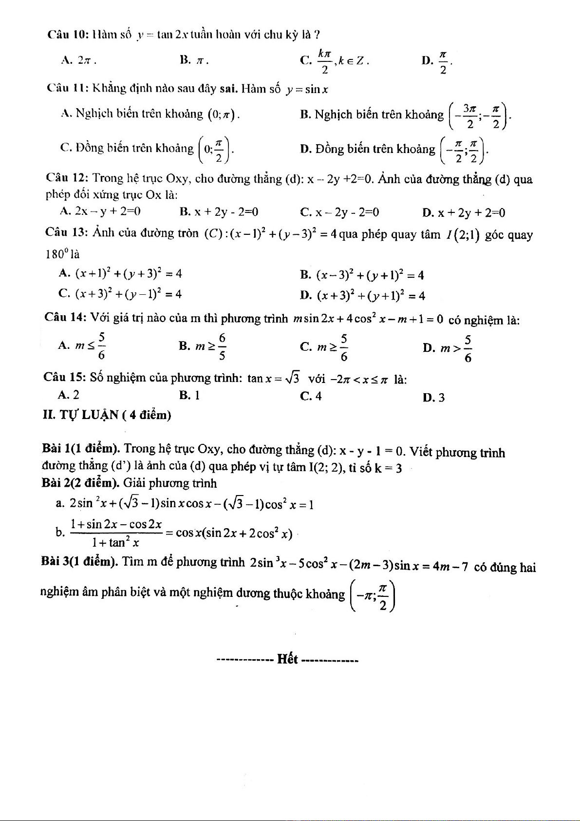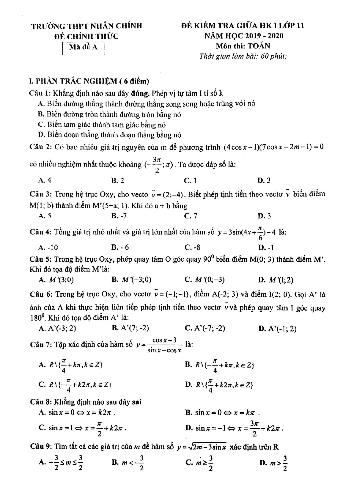 Đề kiểm tra giữa HK1 môn Toán 11 năm 2019-2020 - Trường THPT Nhân Chính