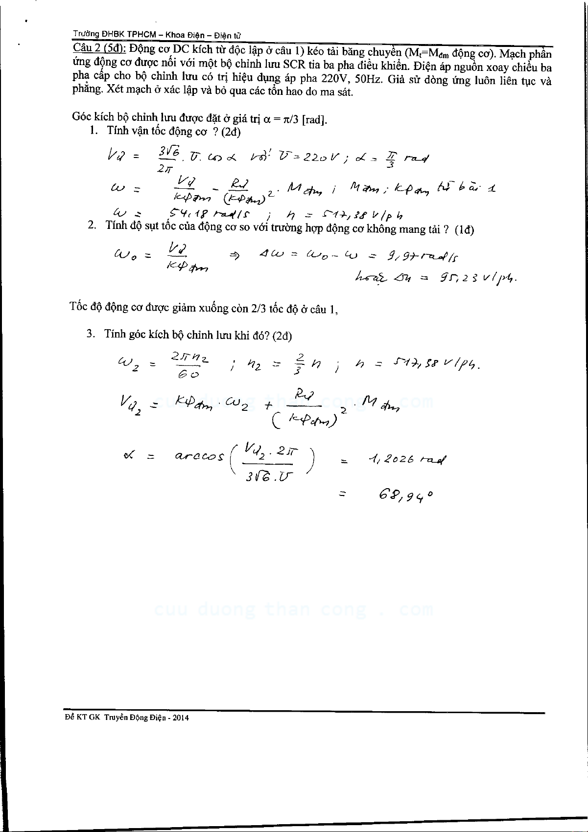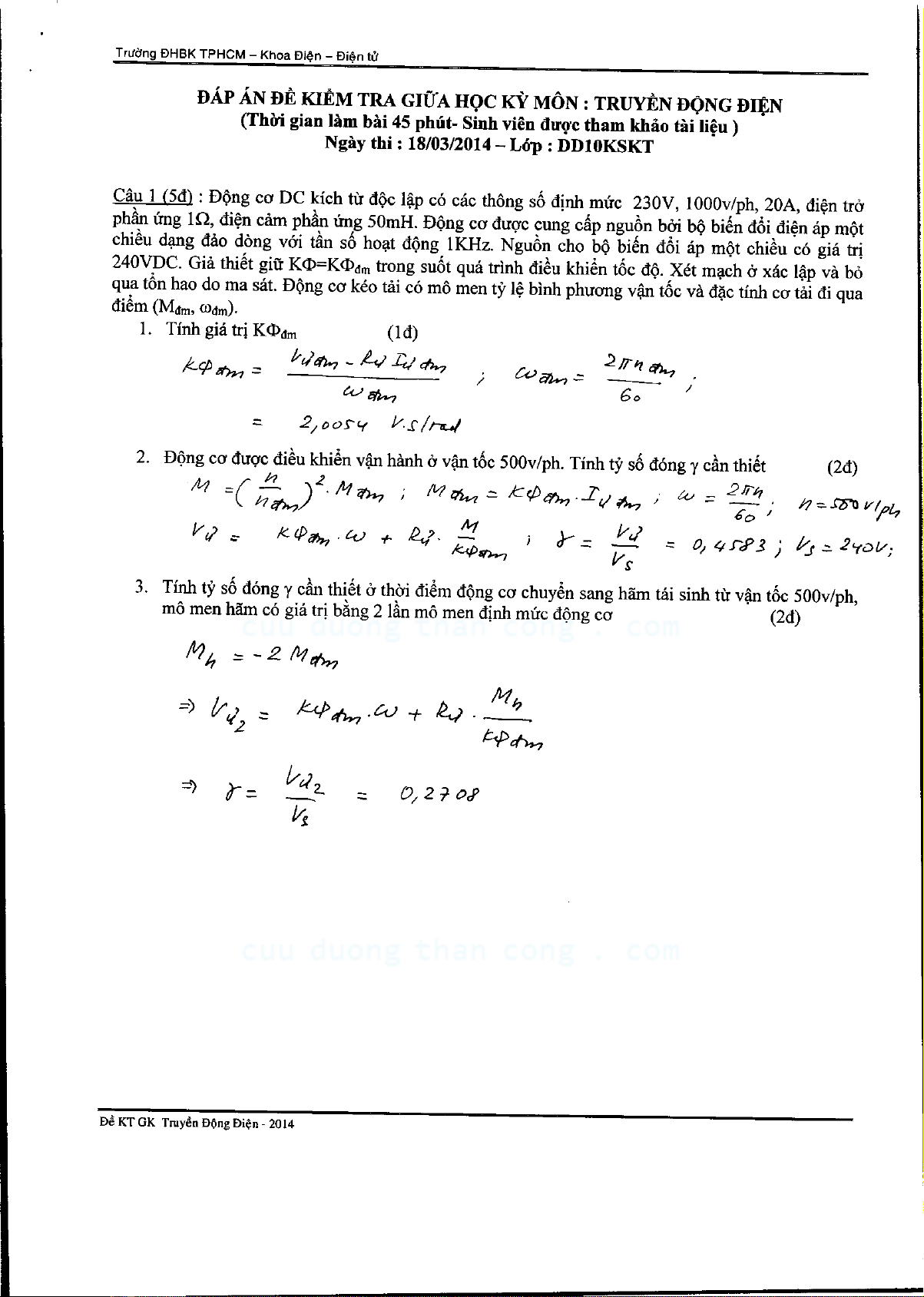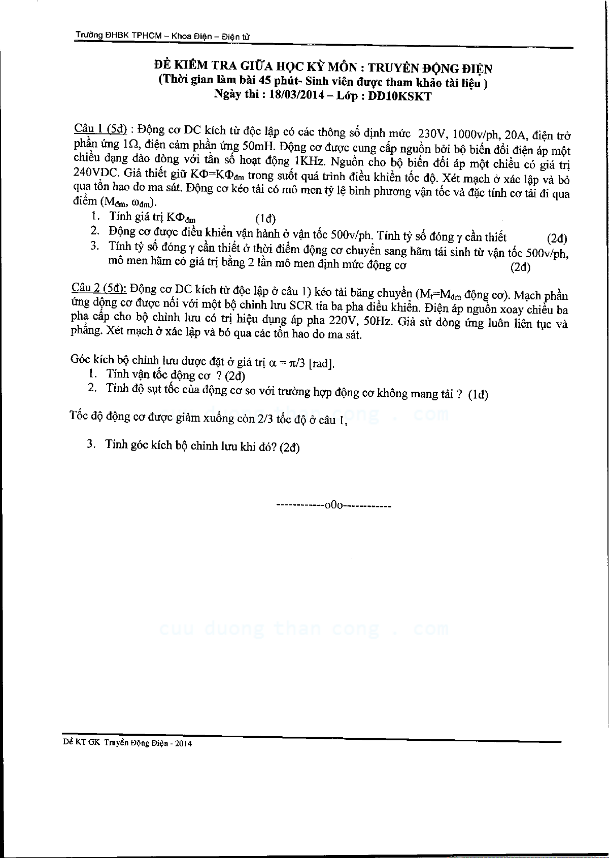 Đề kiểm tra giữa học kỳ môn Truyền động điện