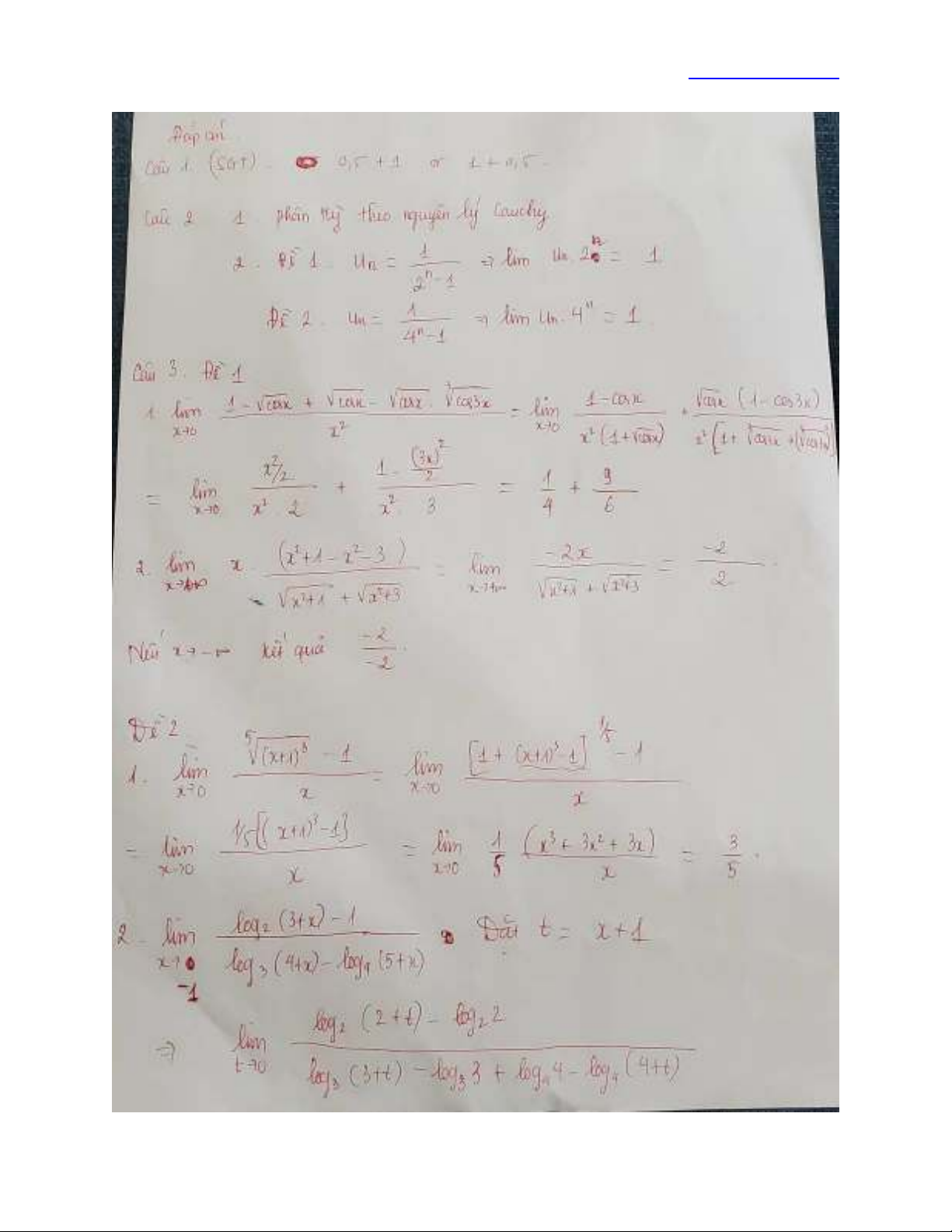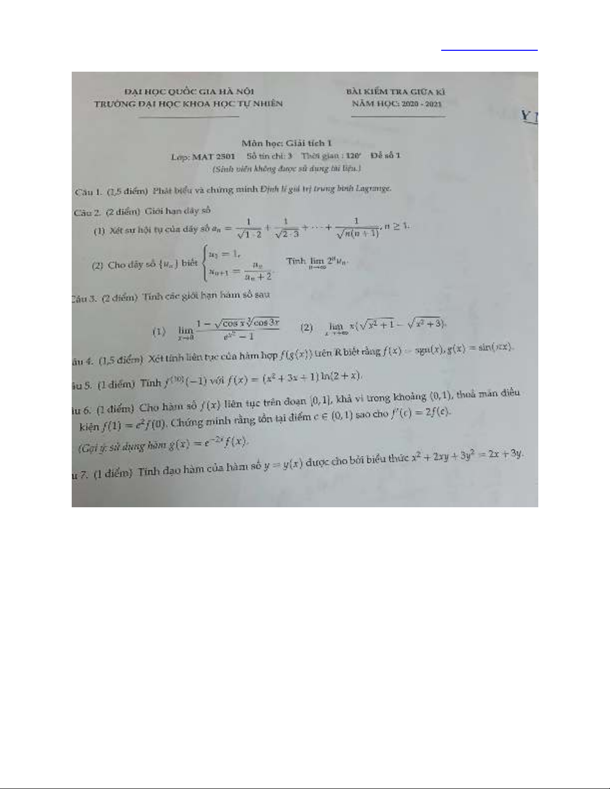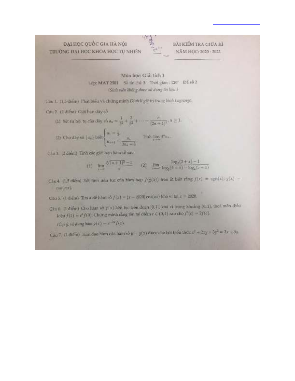 Đề kiểm tra giữa kỳ I năm học 2020-2021 môn Giải tích 1 (Đề số 1) - ĐH Khoa học Tự nhiên