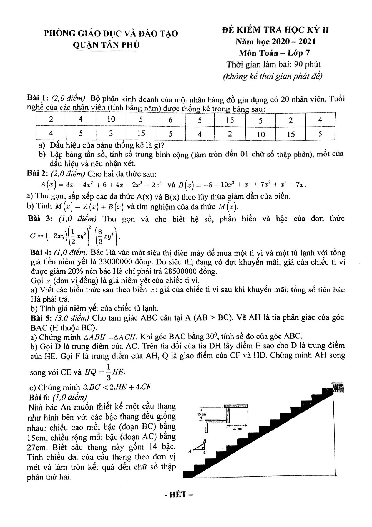Đề kiểm tra học kì 2 môn Toán lớp 7 năm 2020-2021 - Phòng GD&ĐT quận Tân Phú